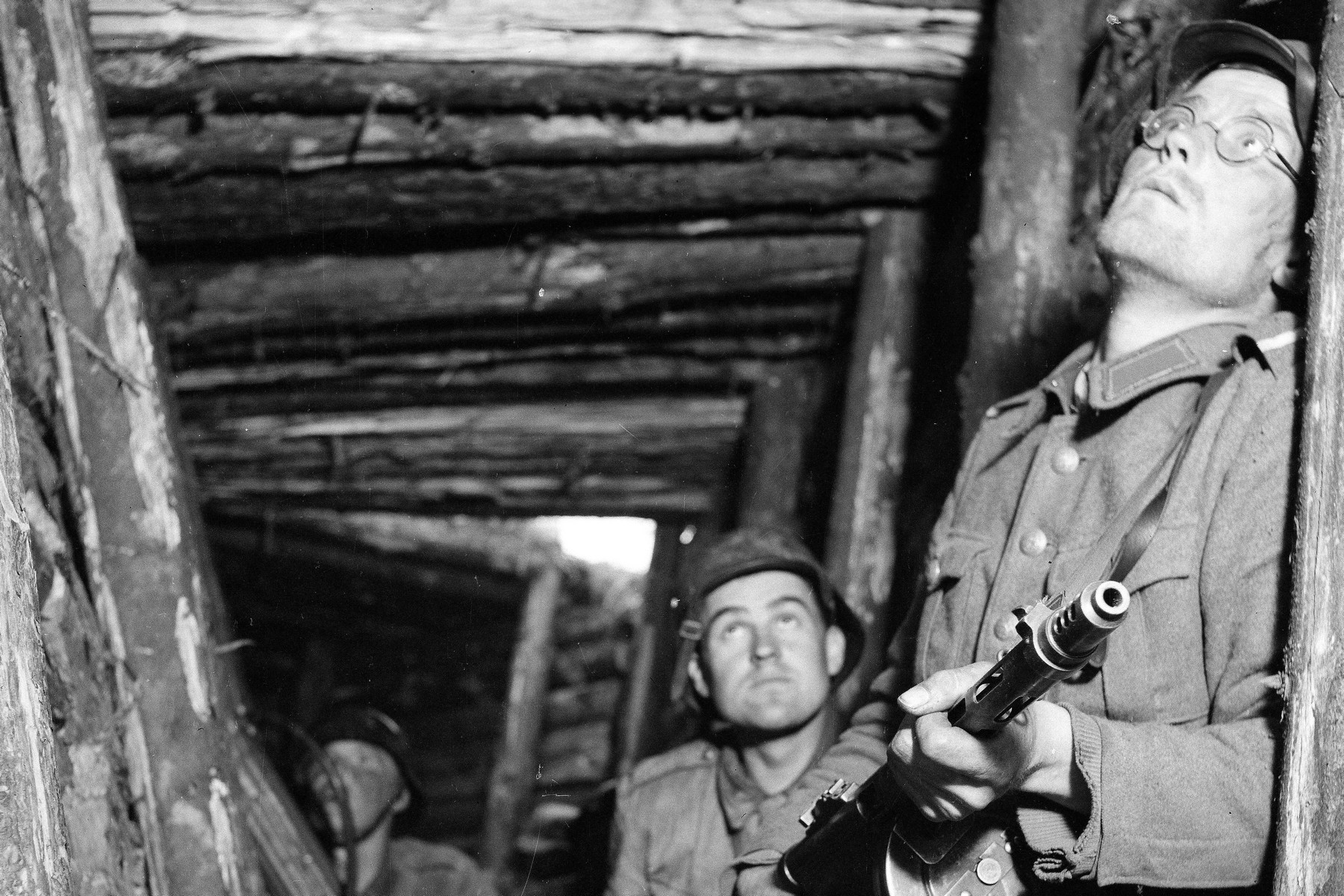 Finští vojáci očekávají sovětský útok v krytu na linii VT, červen 1944.