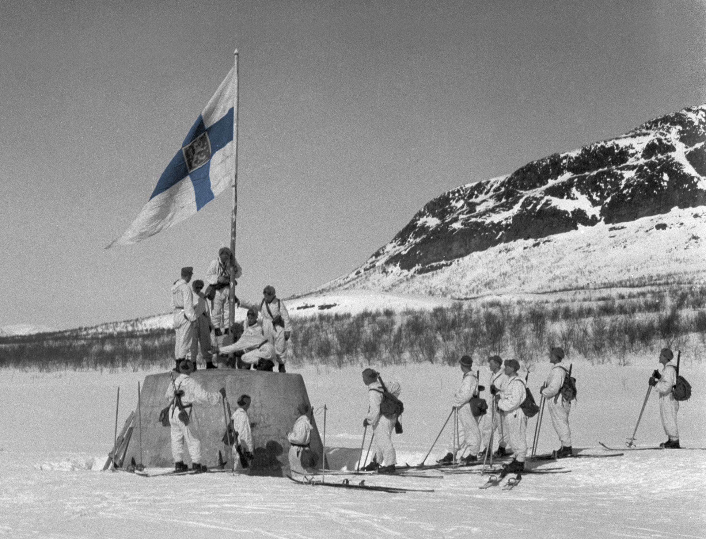 Lyžaři finské armády vztyčují vlajku na umělém ostrově Treriksröset, kde se sbíhají hranice Finska, Švédska a Norska, 27. dubna 1945.