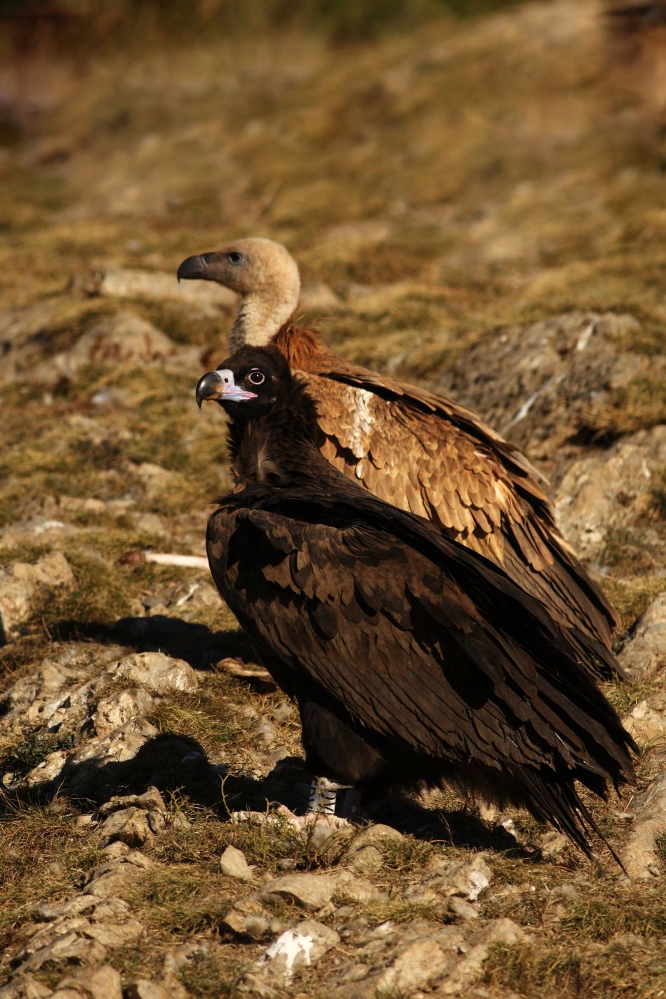 • Porovnání vzhledu supa hnědého (Aegypius monachus, v popředí) a supa bělohlavého (Gyps fulvus, v pozadí).