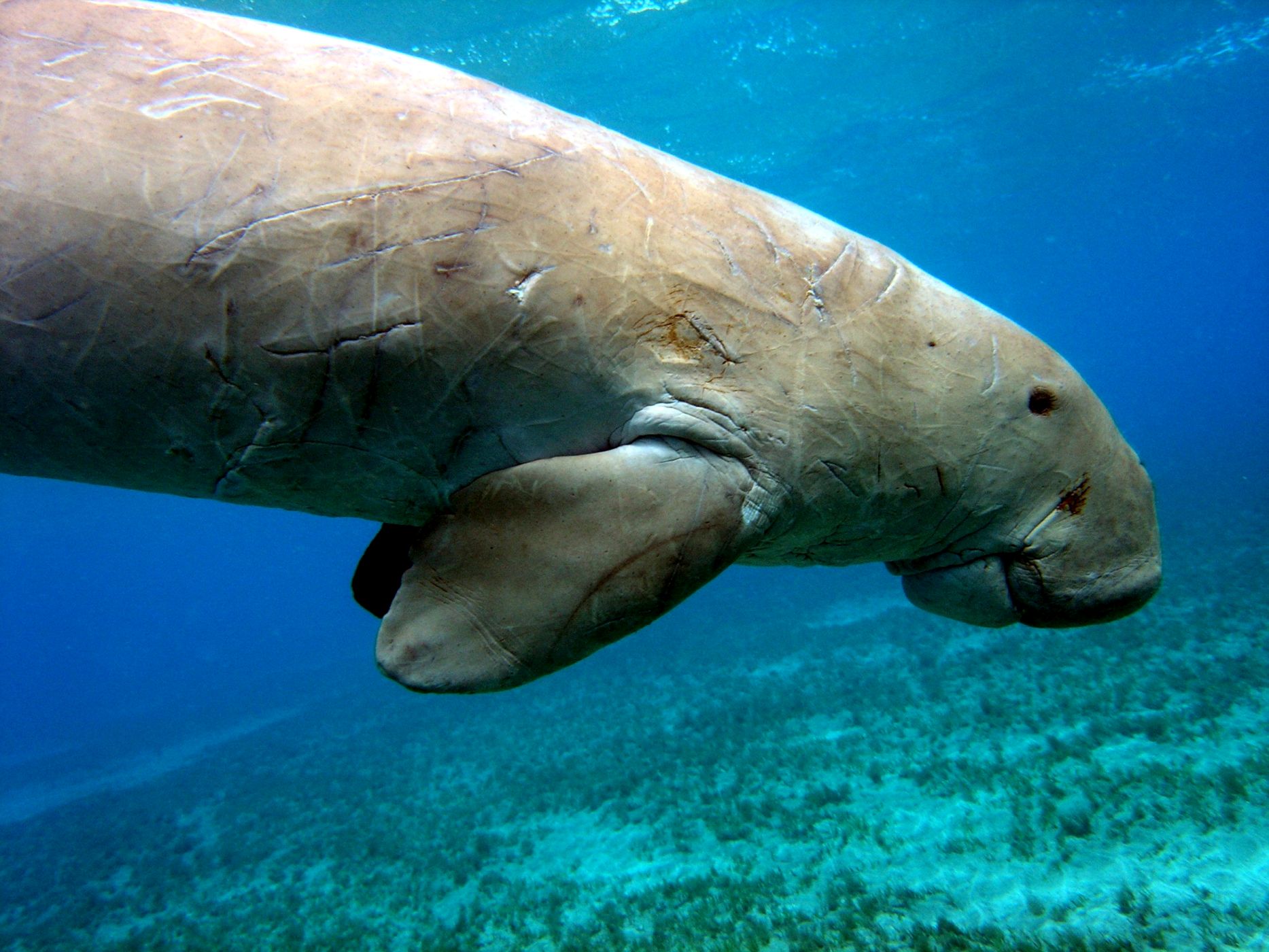 Kůže dugongů je po narození světle krémová a s přibývajícím věkem se přebarvuje do tmavě hnědé až šedé. Šrámy ukazují, že život těchto zvířat je plný nástrah.