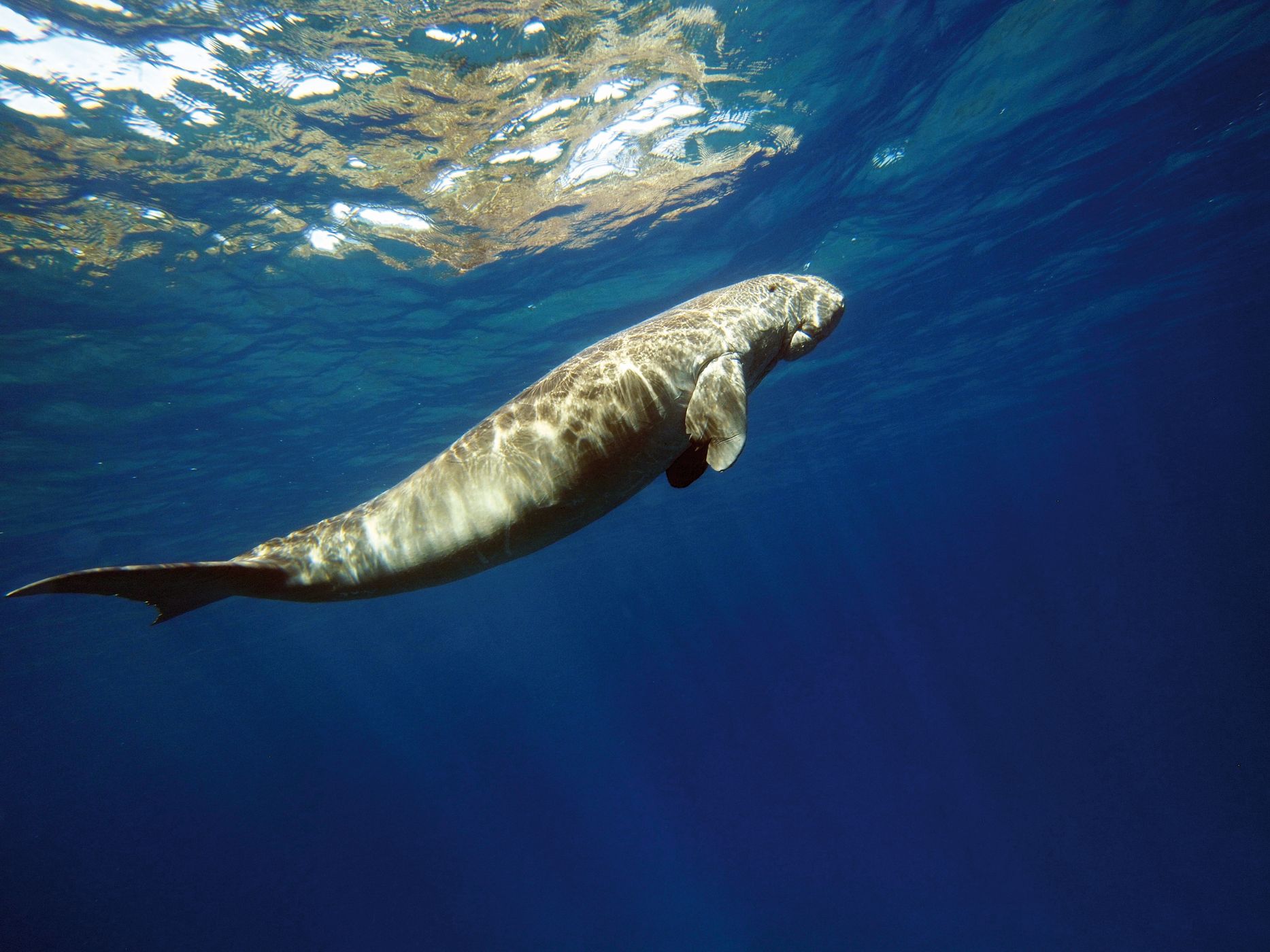 Předními končetinami si dugong pomáhá při pohybu a krmení, ale jeho hlavní „pohonnou jednotku“ představuje mohutný ocas.