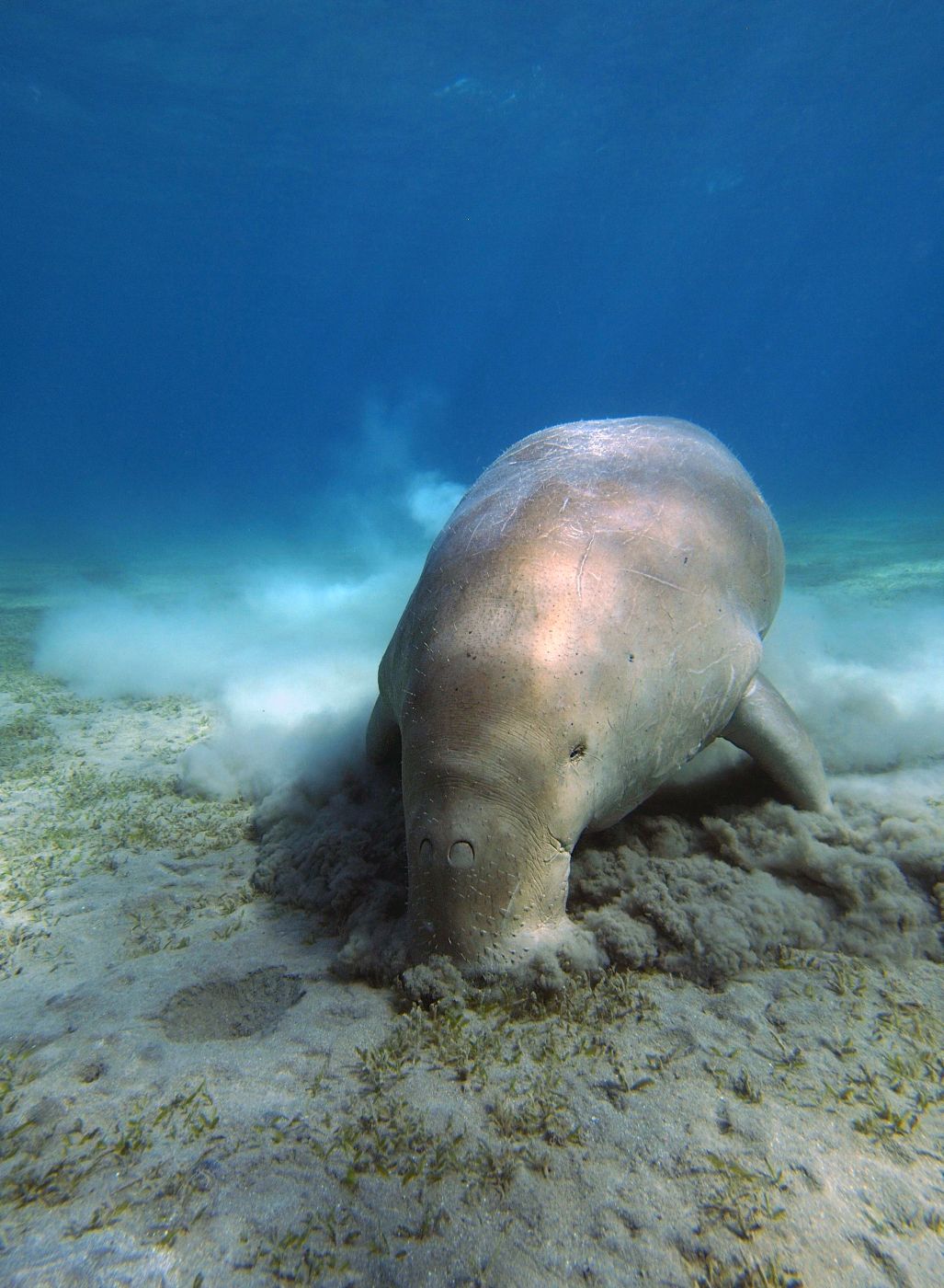 Podle zvířeného písku krmícího se dugonga identifikujete i na poměrně velkou vzdálenost. Pochopitelně v rámci viditelnosti pod hladinou.