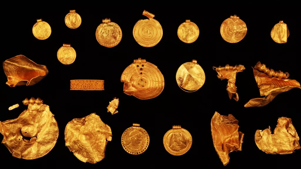 Objevený zlatý poklad obsahuje řadu propracovaných artefaktů.