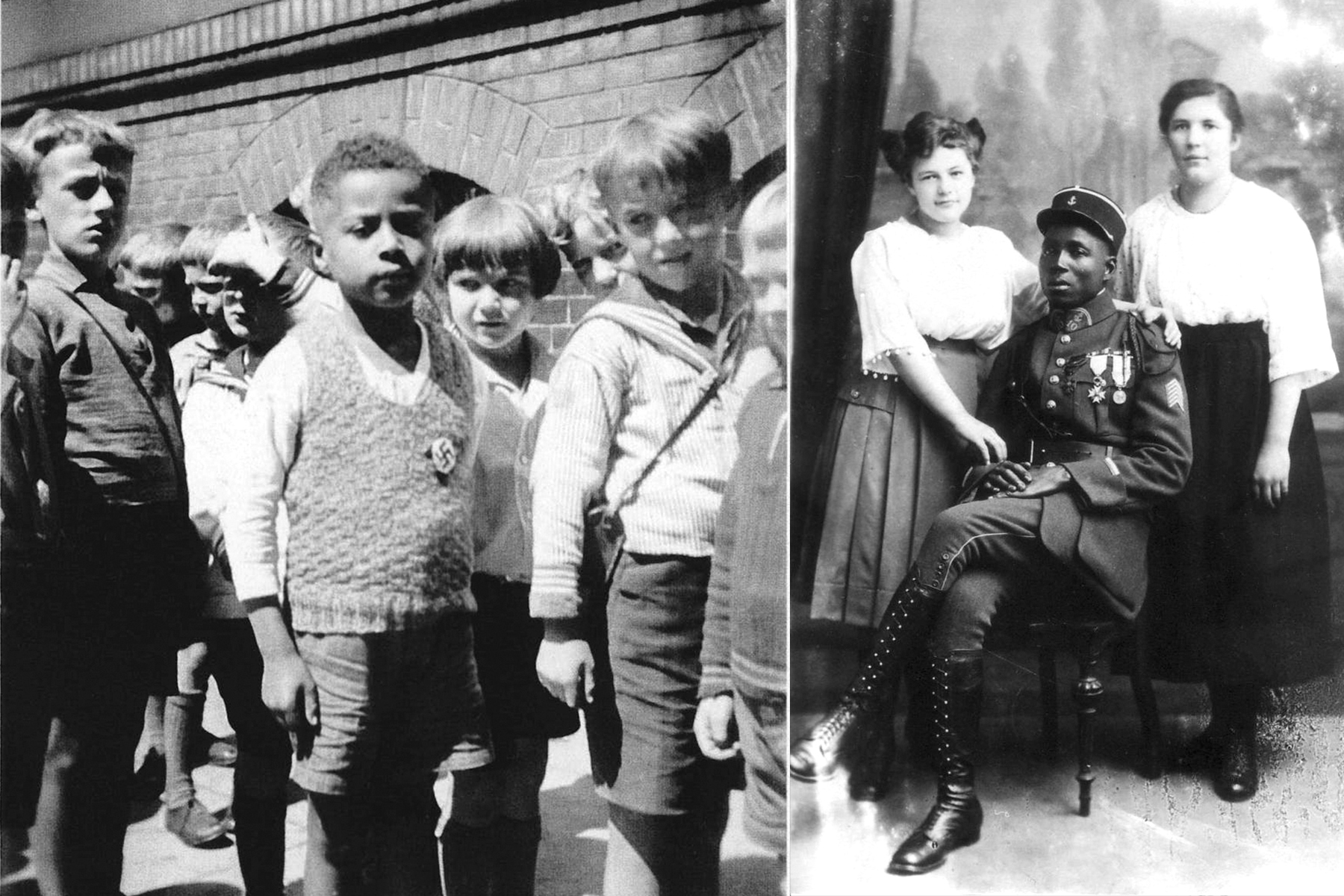 Vlevo Hans Massaquoi na nádvoří školy. Do Hitlerovy mládeže jej nakonec nevzali. Vpravo francouzský koloniální voják se dvěma německými ženami v Porýní.