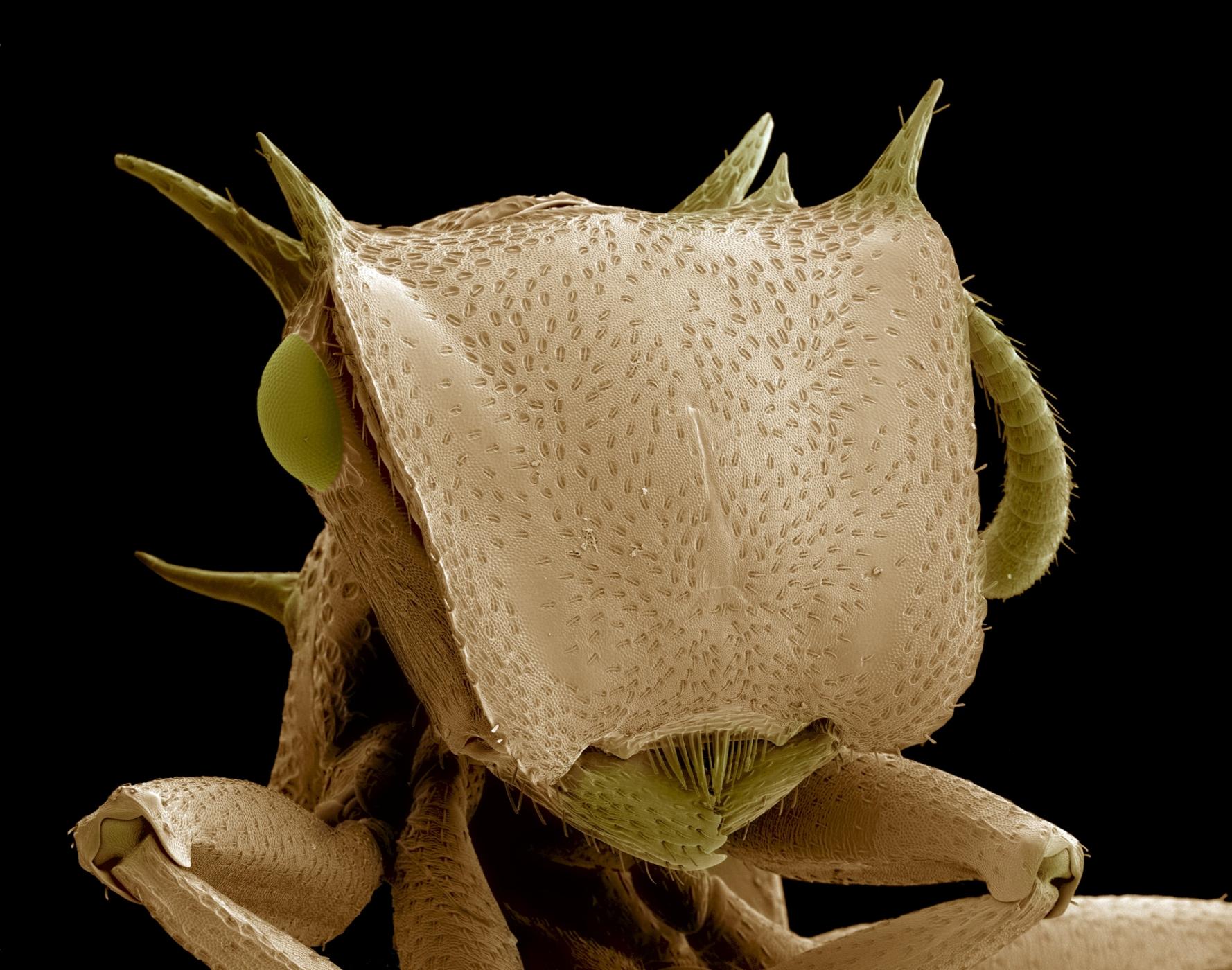 Hlava mravenčího vojáka zachycená elektronovým mikroskopem (SEM). Na snímku je vlevo vidět jedno ze složených očí a pod rozšířenou hlavou jsou patrné čelisti. (foto: Profimedia)