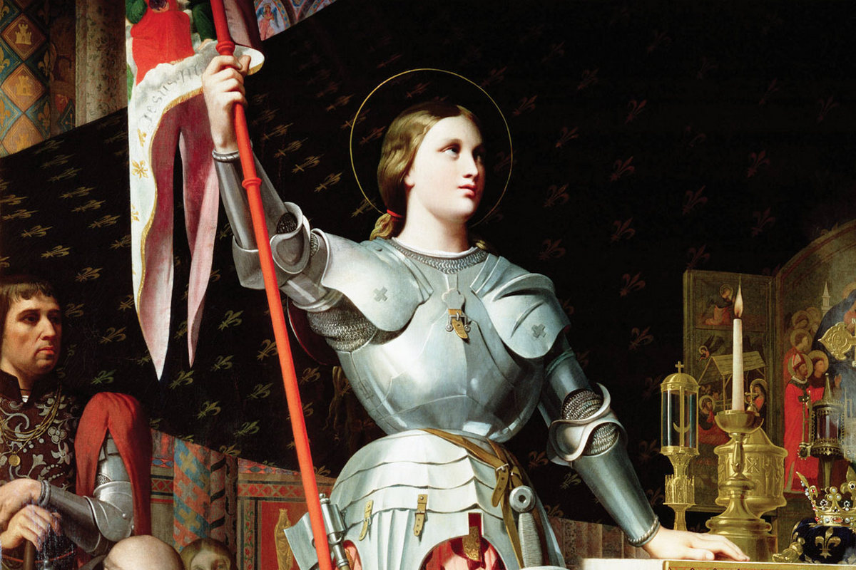 Johanka z Arku během korunovace krále Karla VII. v katedrále v Remeši. Obraz francouzského malíře Jeana Auguste Dominique Ingrese z roku 1854.