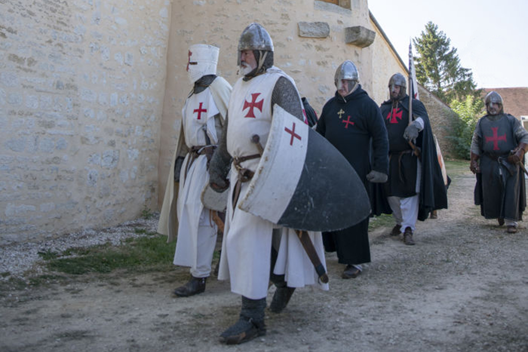 Ve francouzském Avalleur se každoročně konají slavnosti, jež připomínají templářskou minulost. V popředí v bílém jdou bratři, v černém za nimi seržanti.