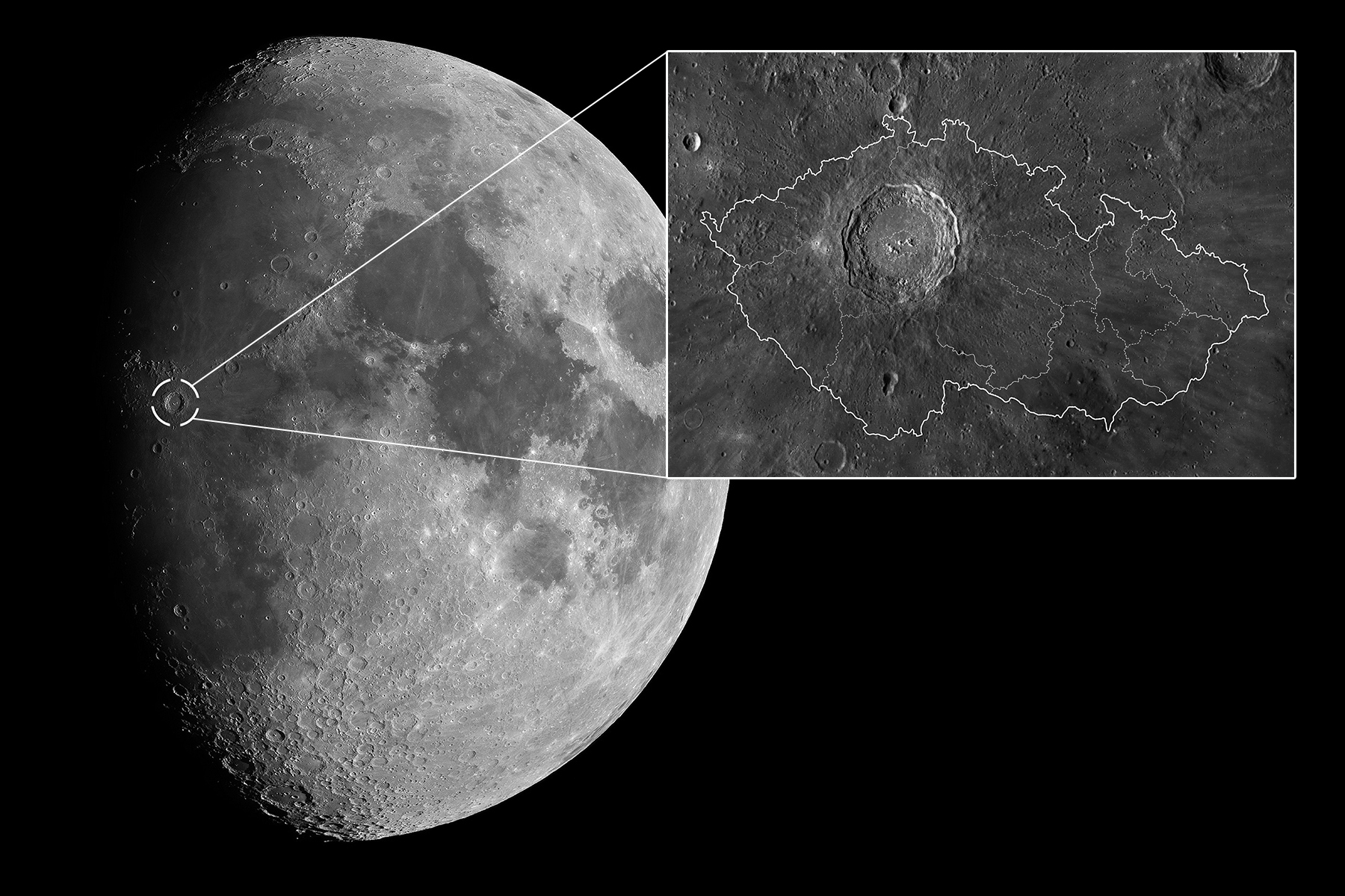 Při pohledu dalekohledem vypadá Koperník jen jako malý kroužek. Ve výřezu Koperník na mapě České republiky.