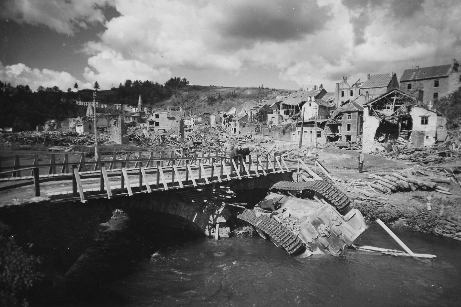 Spojenečtí vojáci si prohlížejí tank Panther, který se převrátil do řeky u belgického města Houffalize.