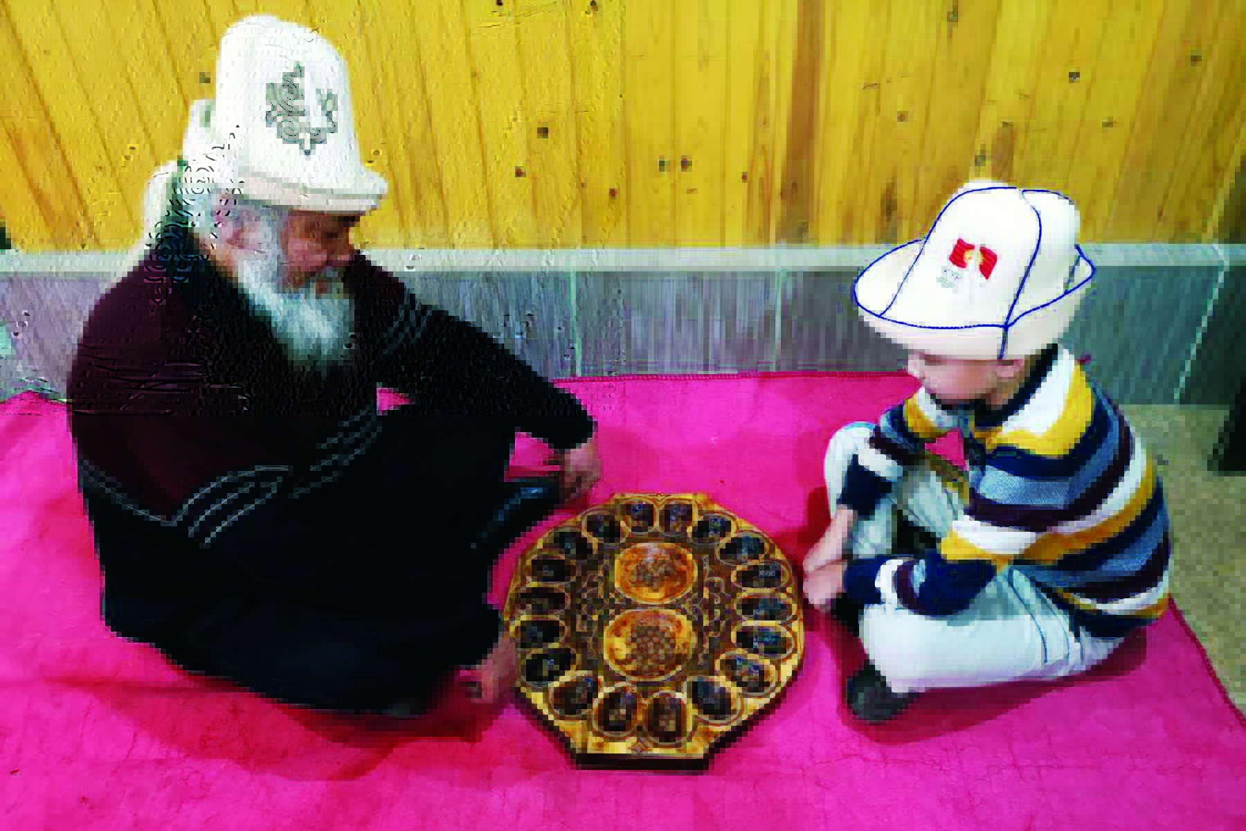 Dědeček s vnukem u hry toguz korgool – v Kyrgyzstánu je toto poměrně běžný obrázek.