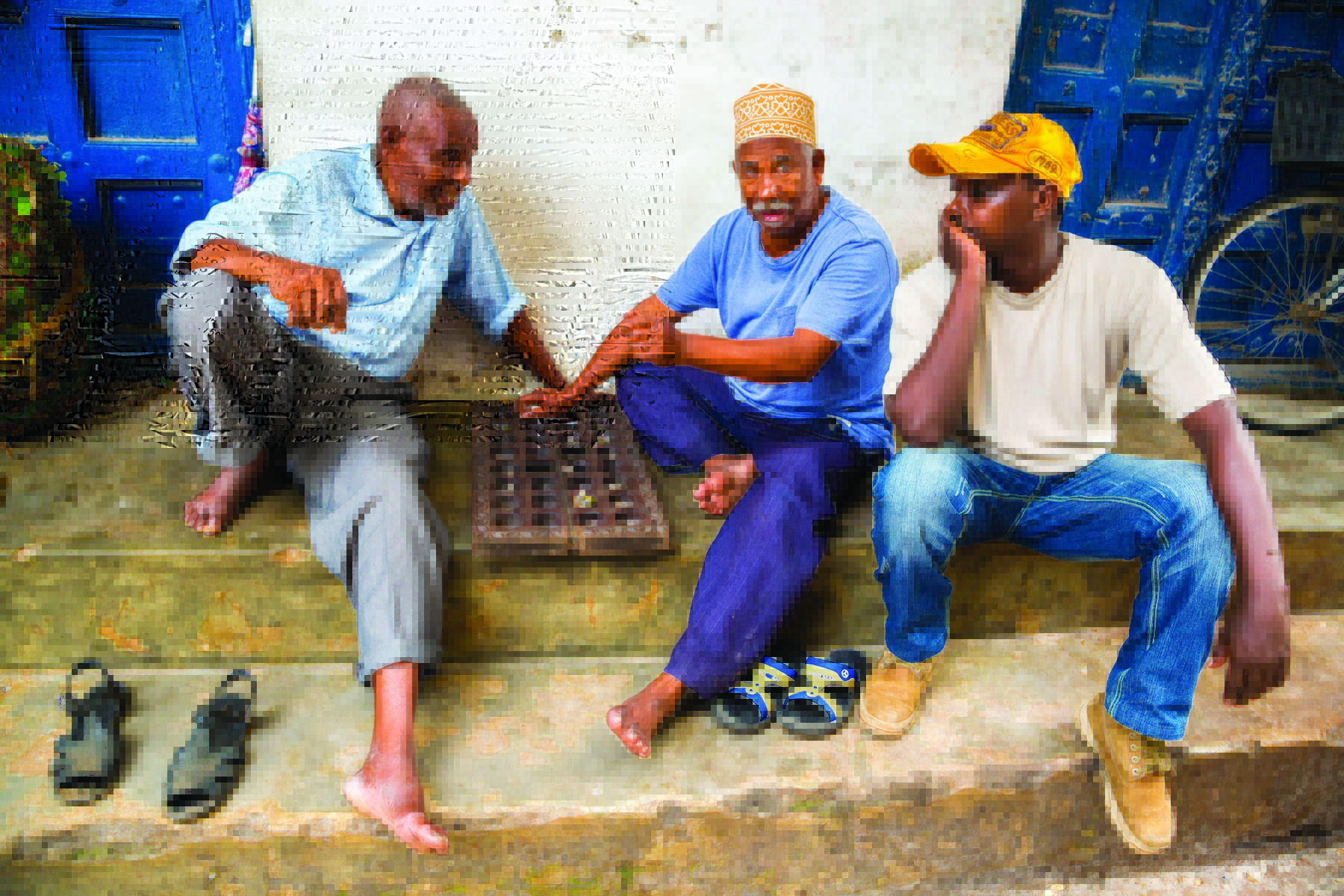 Trojice Tanzanců na Zanzibaru při hře na ulici.