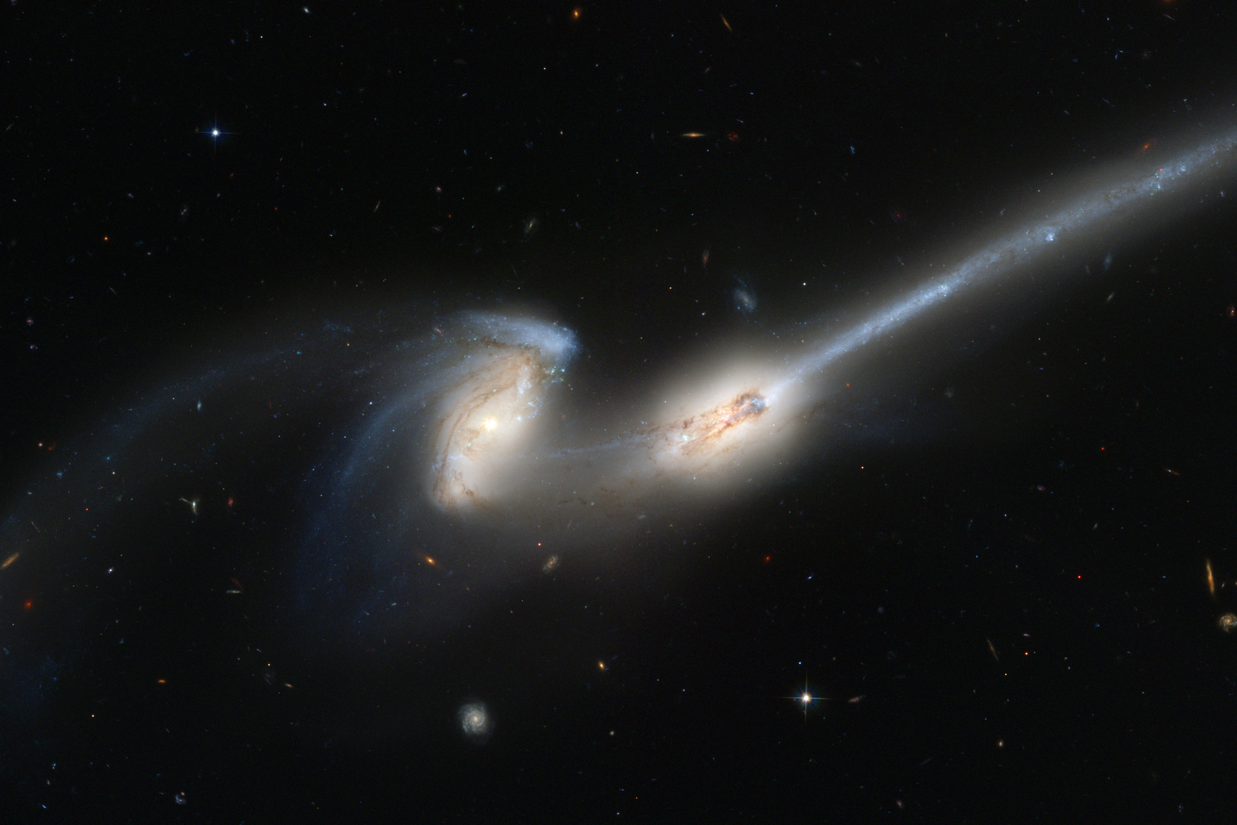 Dlouhé ohony dvojice galaxií NGC 4676, známé jako Myši, byly vytaženy gravitačními slapy v důsledku interakce obou hvězdných ostrovů.