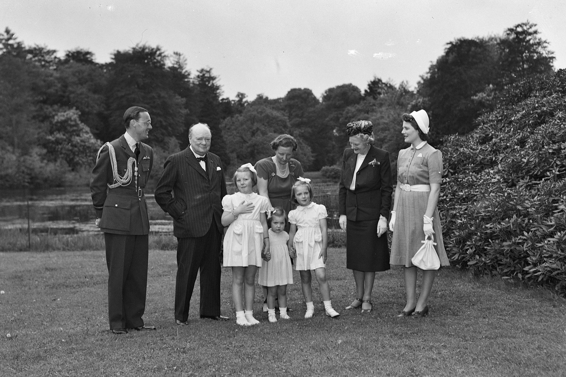 Winston Churchill s manželkou Clementine na návštěvě v Soestdijkském paláci. Vedle Churchilla stojí princ Bernhard a nizozemská královna Juliána s dětmi.
