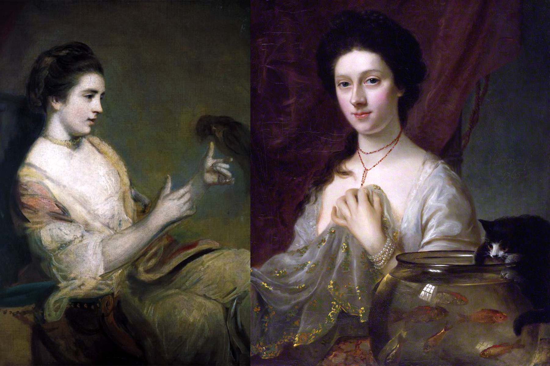Krásná Catherine Kitty Fisher. Vlevo portrét s papuškem od Joshua Reynoldse, vpravo Kitty a její kočka lovící zlaté rybky.