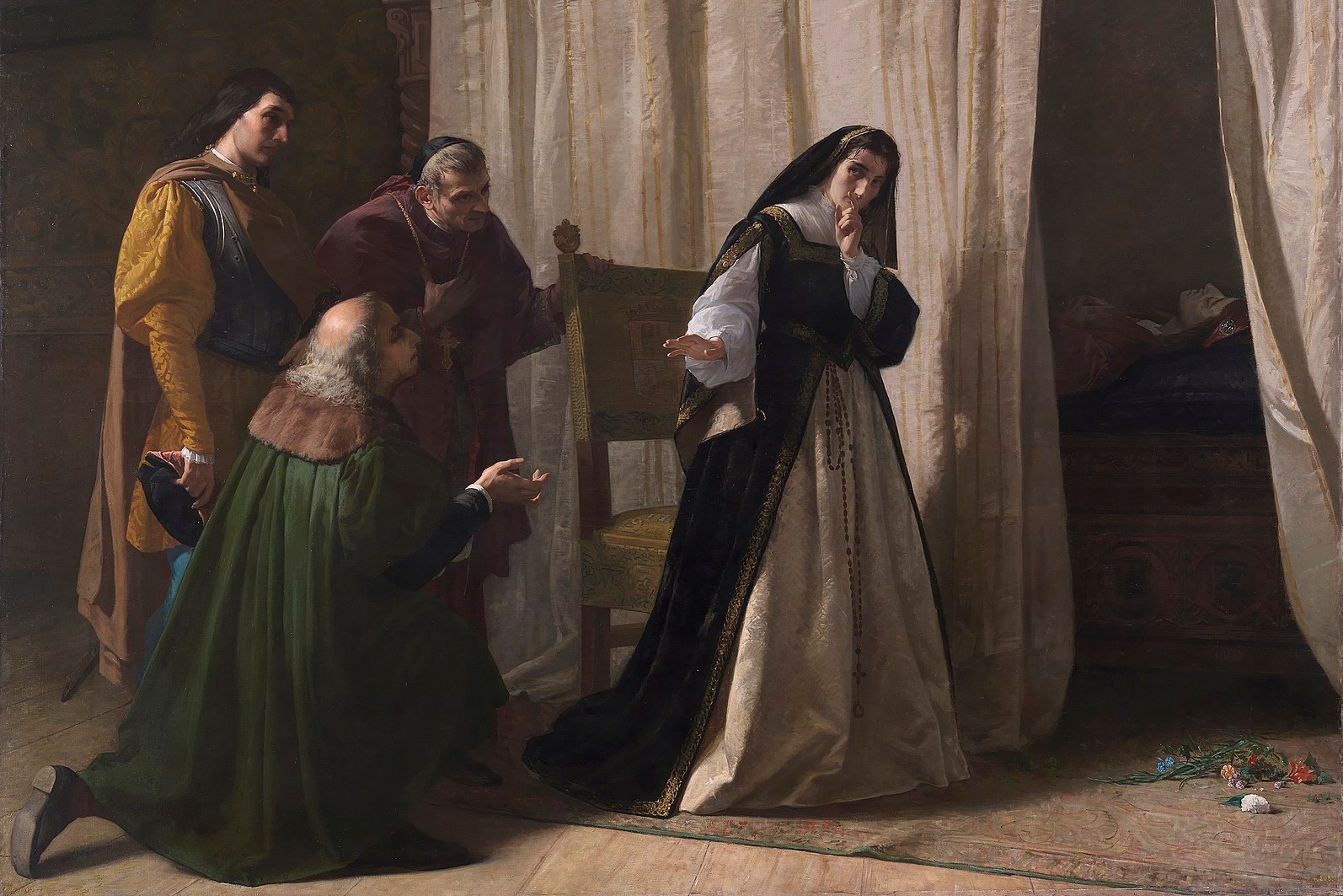Jana I. Kastilská u lože mrtvého manžela na obraze španělského malíře Lorenzo Vallése.