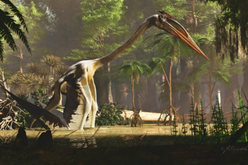 Monumentální Quetzalcoatlus northropi – obrovští ptakoještěři zřejmě lovili kořist jako jeřábi, vzlétali muhutným skokem a vznášeli se jako kondoři.