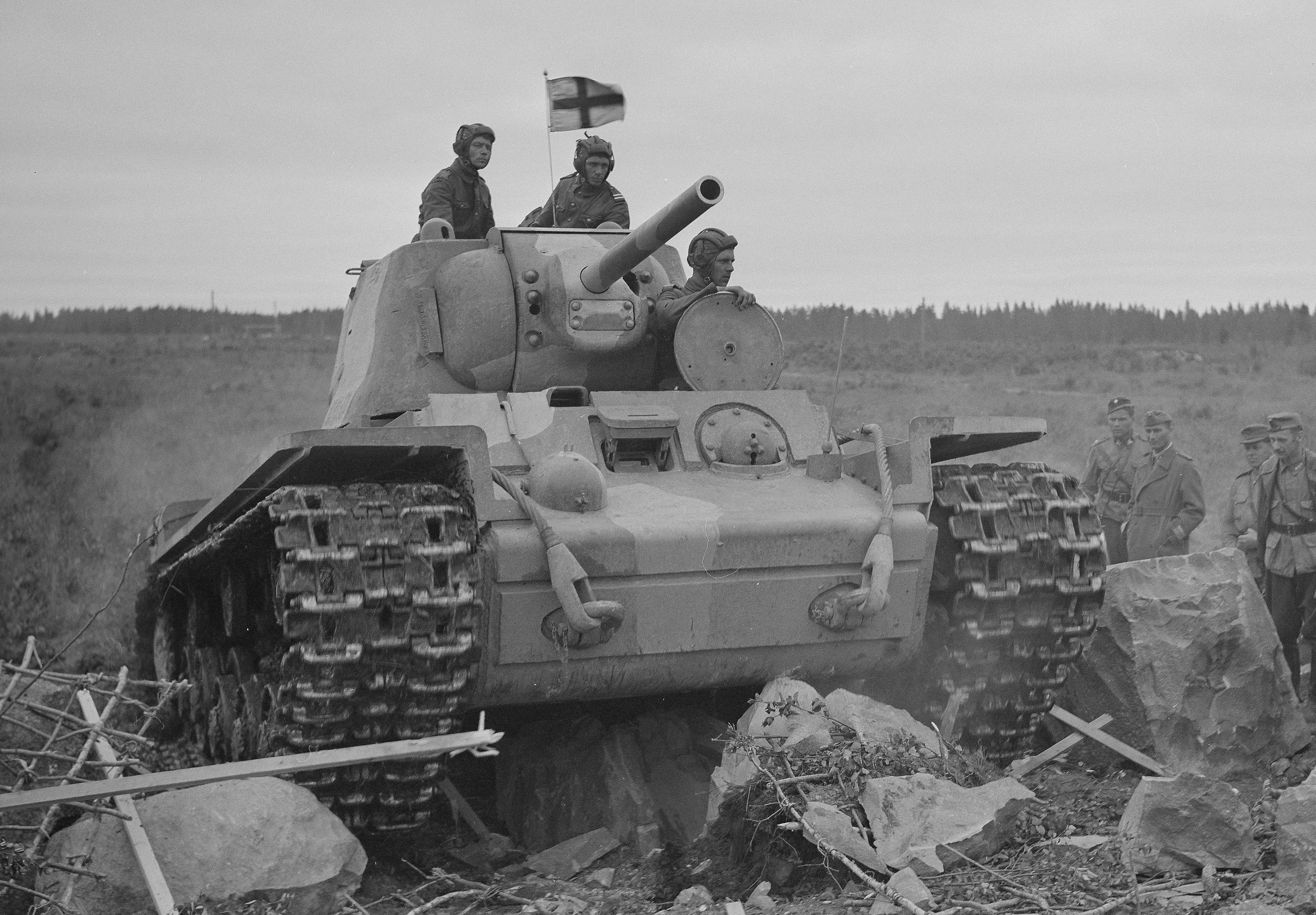 Finští vojáci testují improvizovanou protitankovou překážku pomocí ukořistěného těžkého tanku KV-1, okolí Petroskoi, červenec 1943