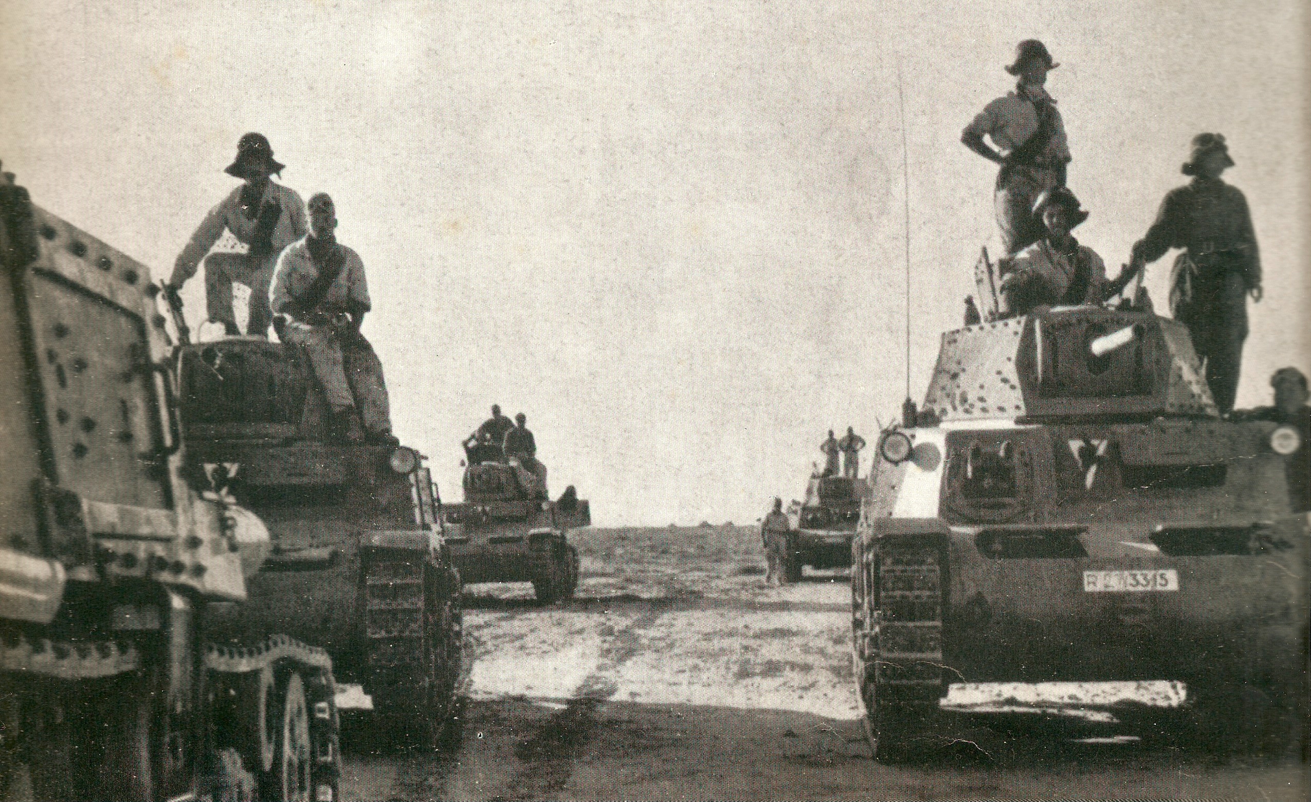 Italské tanky M13/40 postupují africkou pouští. Část Nichollsových obětí tvořily tyto stroje