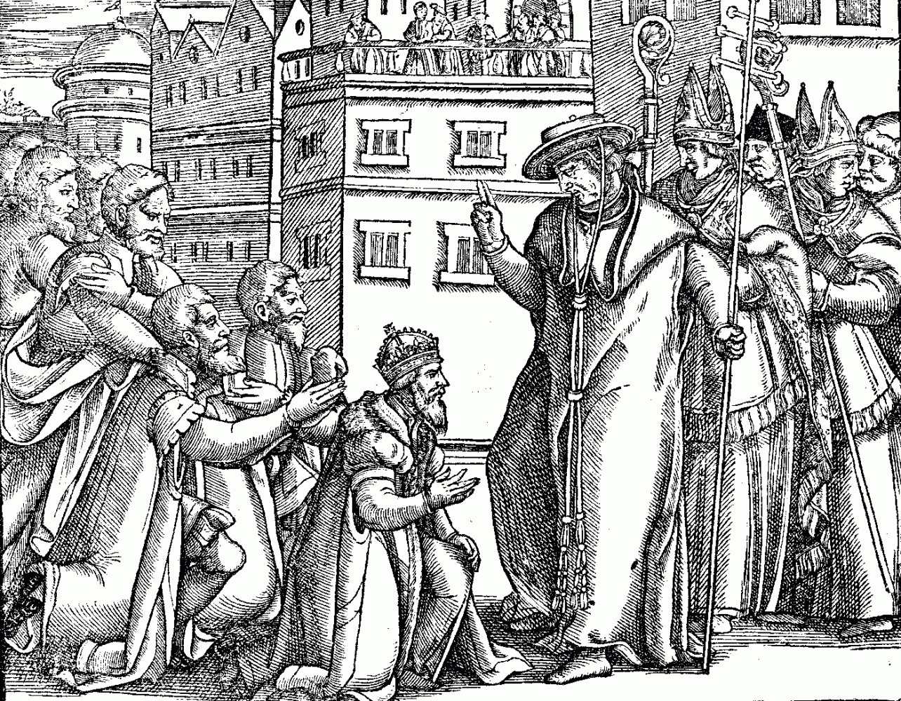 Příjezd legáta měl stejnou autoritu jako příjezd samotného papeže. Na dřevorytu líbá legátovi koleno anglický král Jiří II.