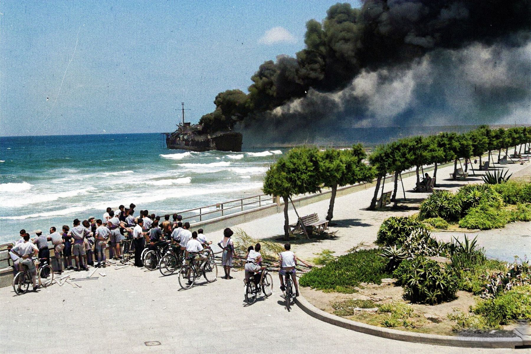 Loď Altalena přivážející zbraně pro Irgun se stala cílem palby vládních jednotek židovského státu. (kolorováno).