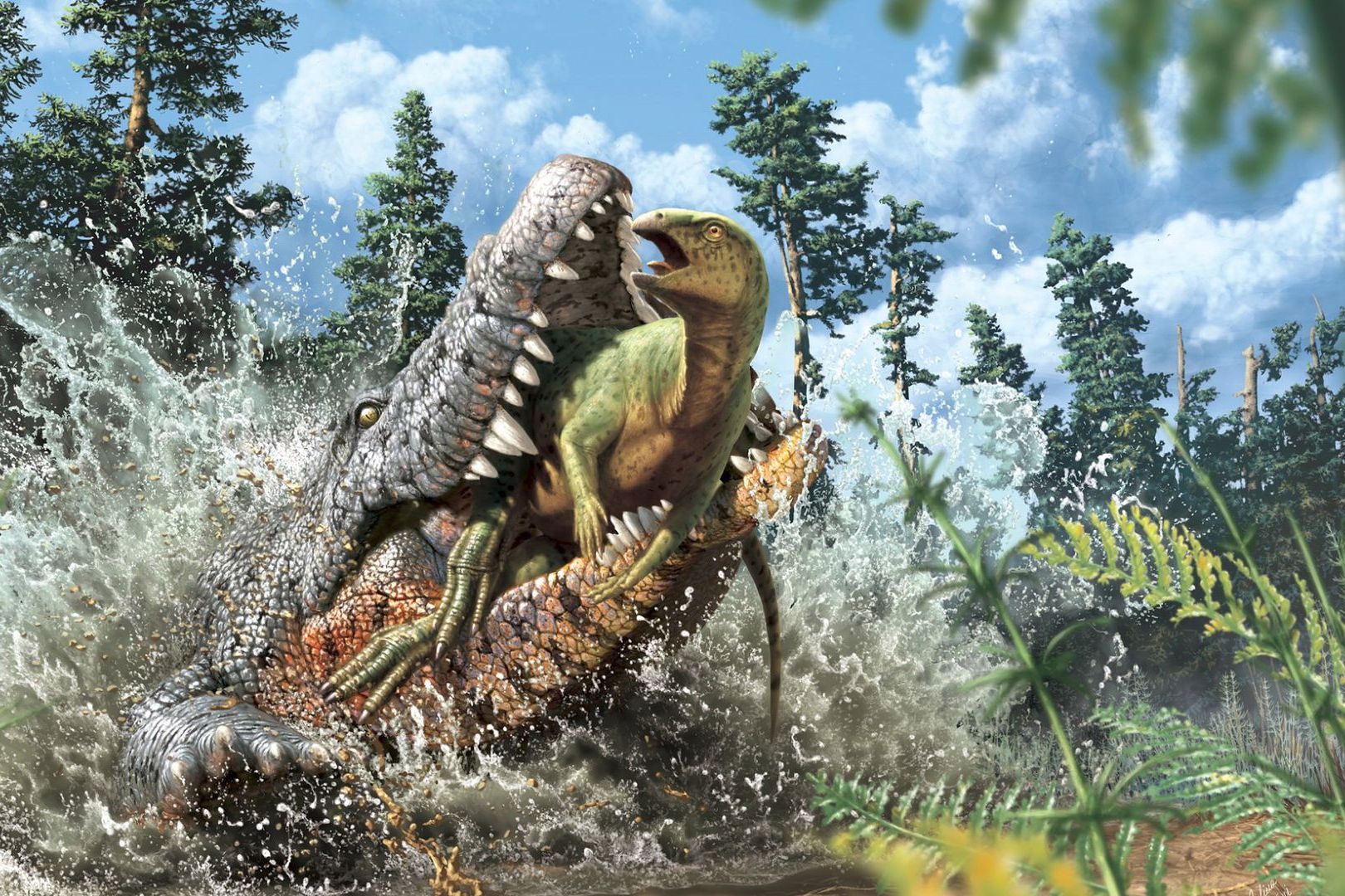 Nově objevený krokodýl Confractosuchus sauroktonos těsně před smrtí slupnul malého ornitopodního dinosaura.
