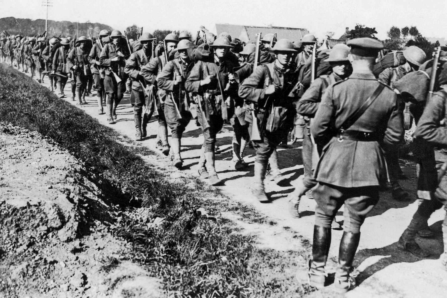 Američtí pěšáci mašírují do války. Než se však jejich vlast zapojila do konfliktu, finančně podporovala státy Dohody.