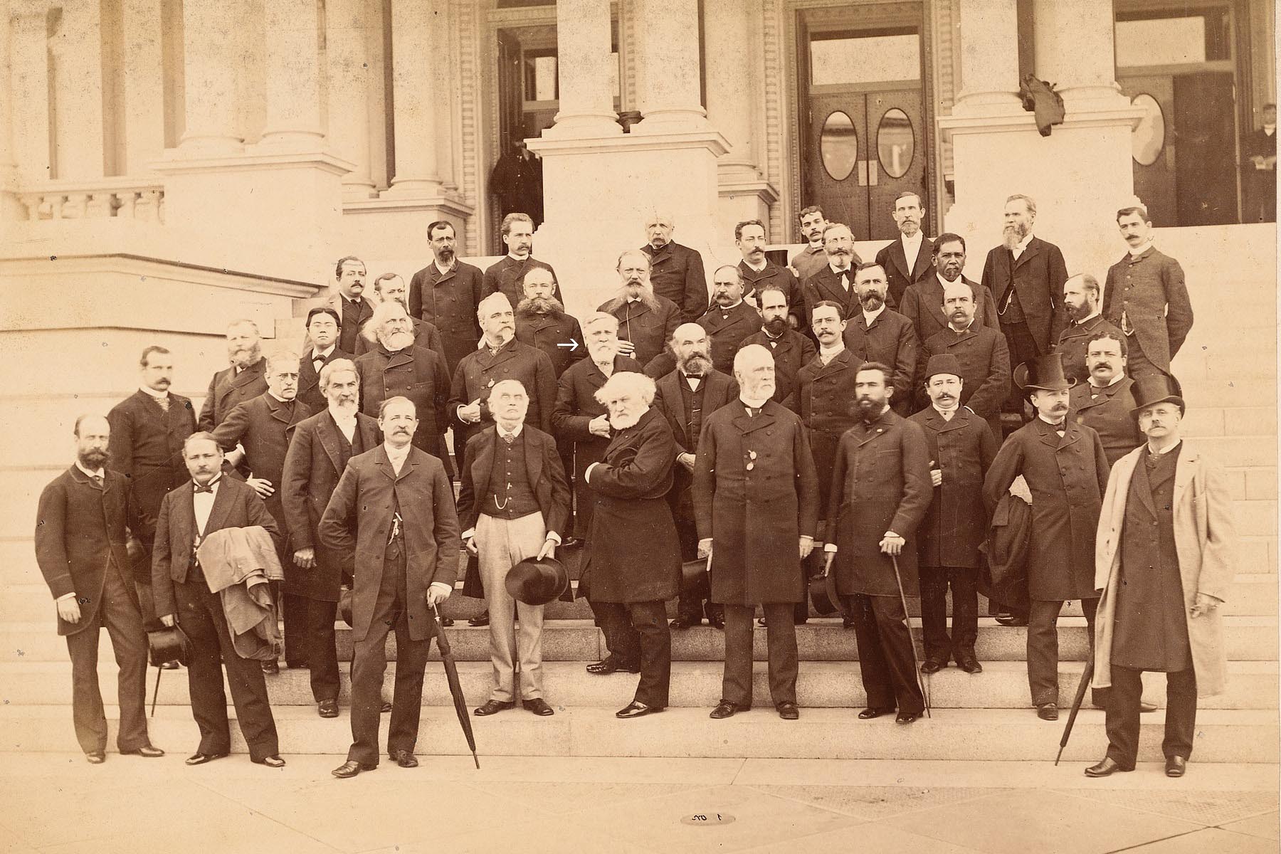 Mezinárodní konference věnovaná nultému poledníku ve Washingtonu roku 1884 – Sir Evans je označen šipkou.