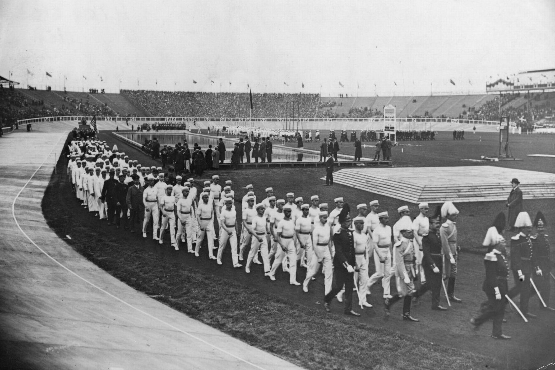 Nástup švédských atletů na Letních olympijských hrách v Londýně v roce 1908. Her se zúčastnilo 19 českých sportovců a poprvé se zde uskutečnil zahajovací ceremoniál (Parade of Nations). (foto: Getty Images)