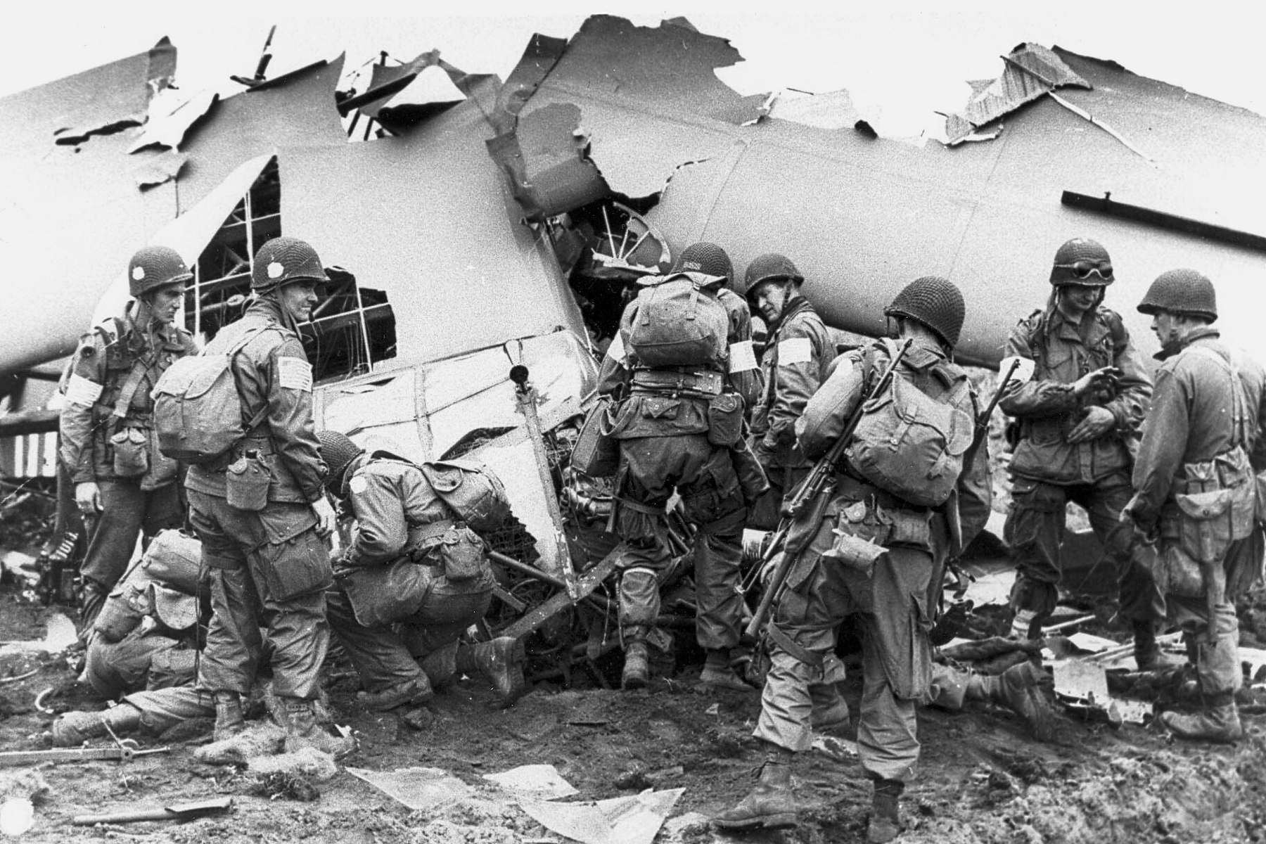 Ameriští výsadkáři ze 101. výsadkové divize si prohlížejí jeden z poničených kluzáků.
