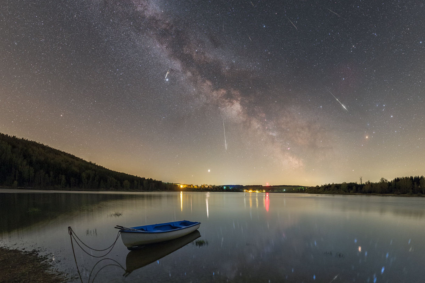 Příležitost spatřit „padající hvězdy“ bude již příští týden - 22. dubna nastává maximum meteorického roje Lyrid. Takto je v roce 2020 zachytil nad vodní nádrží Seč astrofotograf Petr Horálek.
