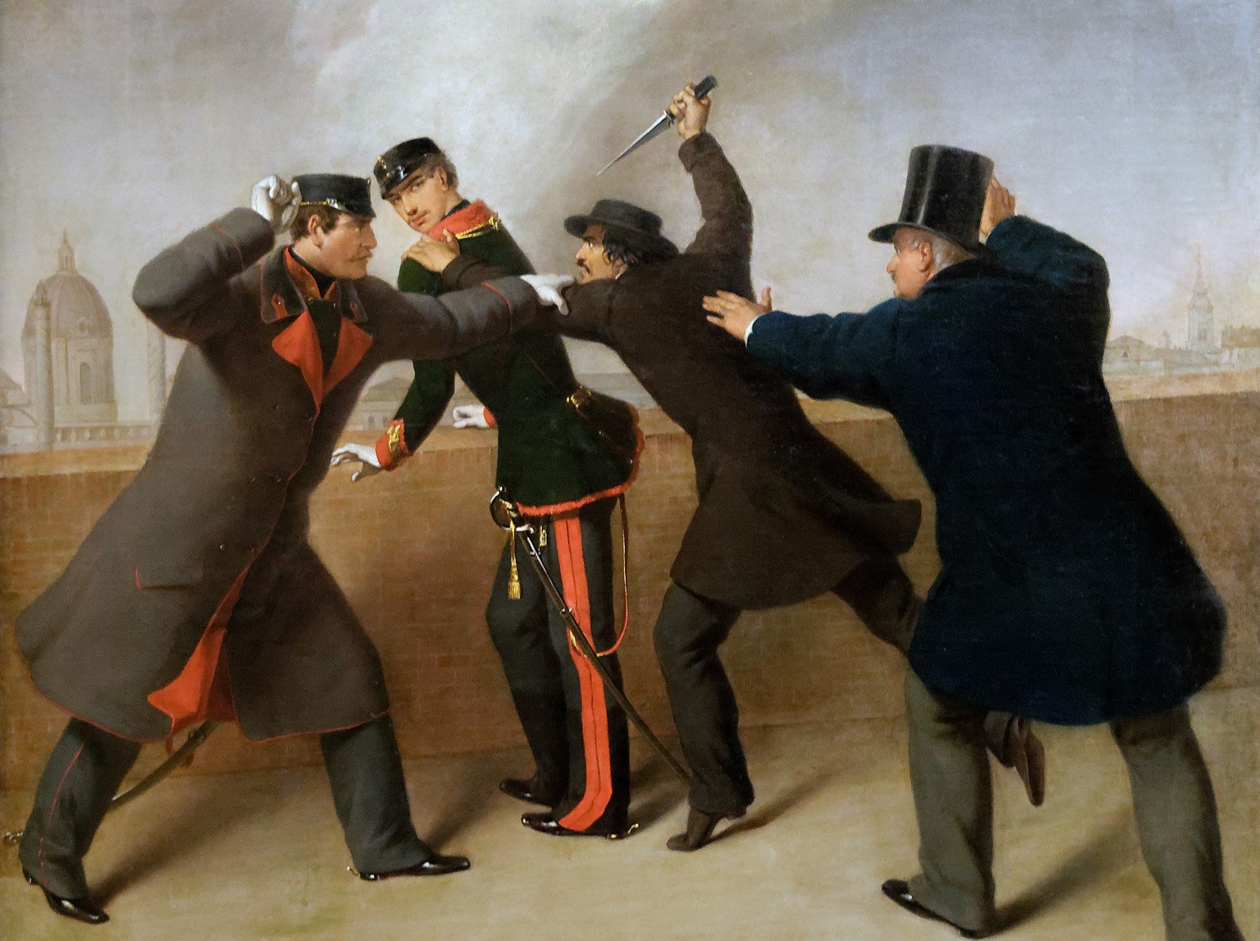 Pobočník O‘Donell (vlevo) a špeditér Josef Ettenreich se snaží zastavit atentátníka Libényiho, napřahujícího se k další ráně. Olej Johanna Josepha Reinera z roku 1853.