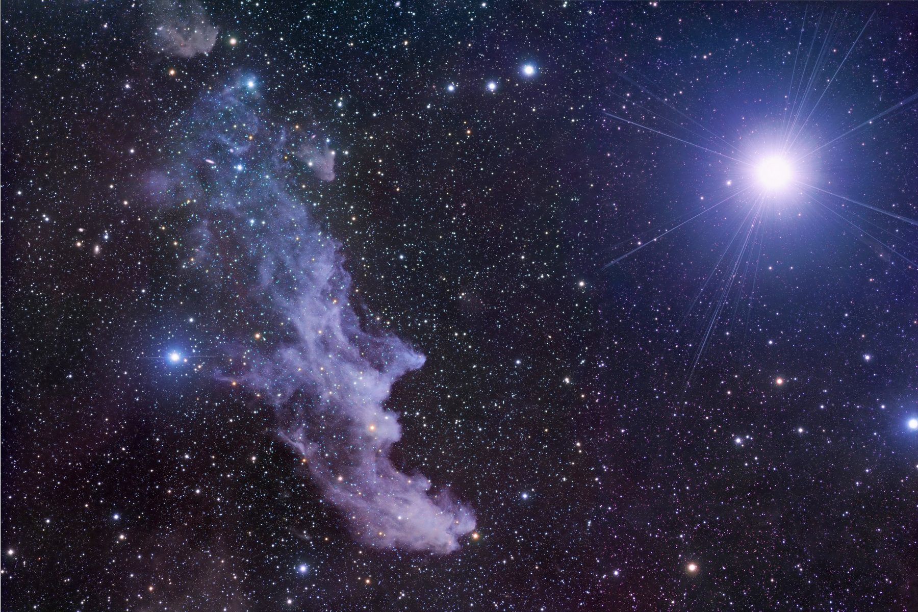 Sugestivně tvarovaná reflexní mlhovina IC 2118 ze souhvězdí Oriona, zcela pochopitelně známější pod názvem Hlava čarodějnice, září především odraženým světlem hvězdy Rigel, kterou upřeně „sleduje“.