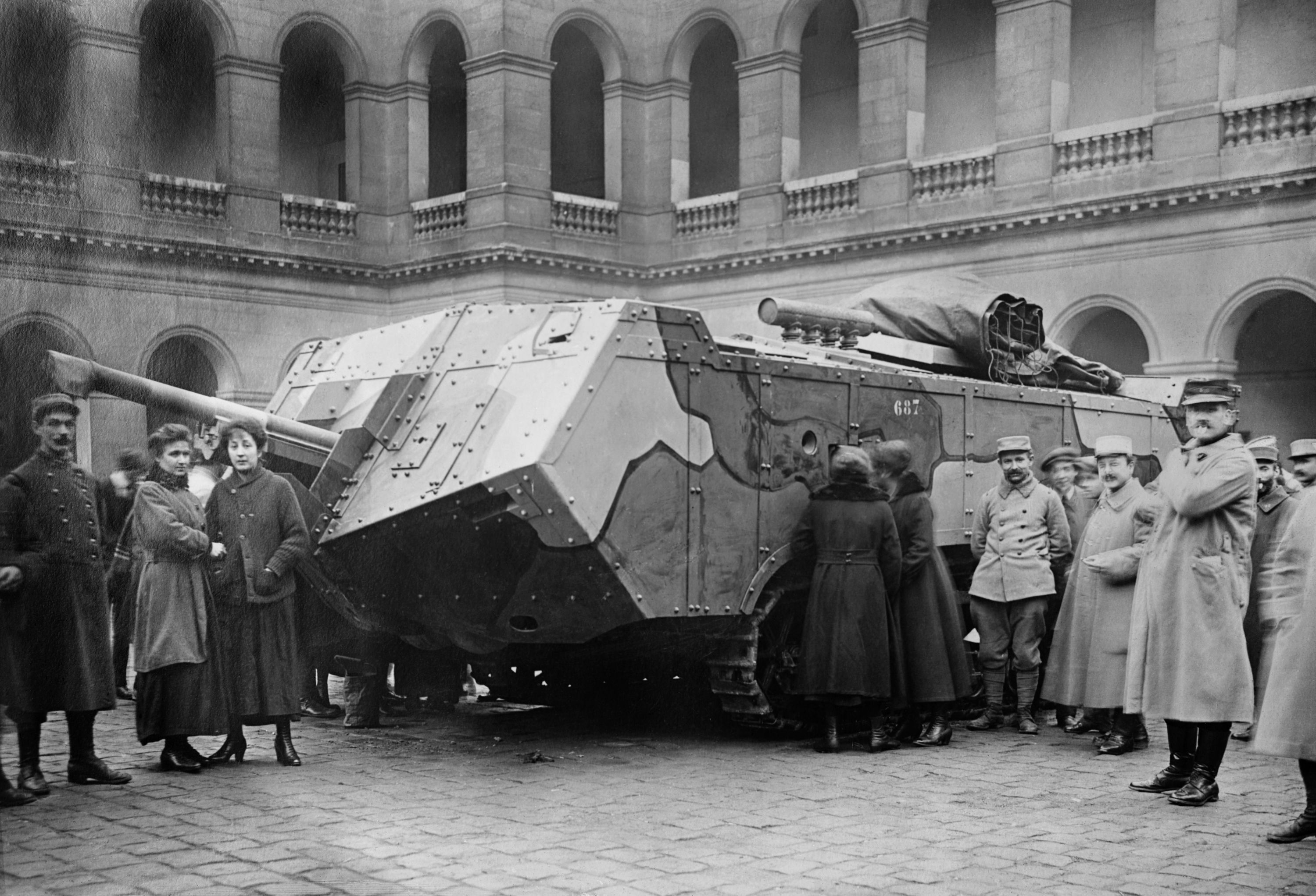 Francouzský tank Saint-Chamond na výstavě v zázemí. Konstruktéři uvnitř stroje šetřili místem, ale ovládání bylo oproti britským strojům jednodušší.