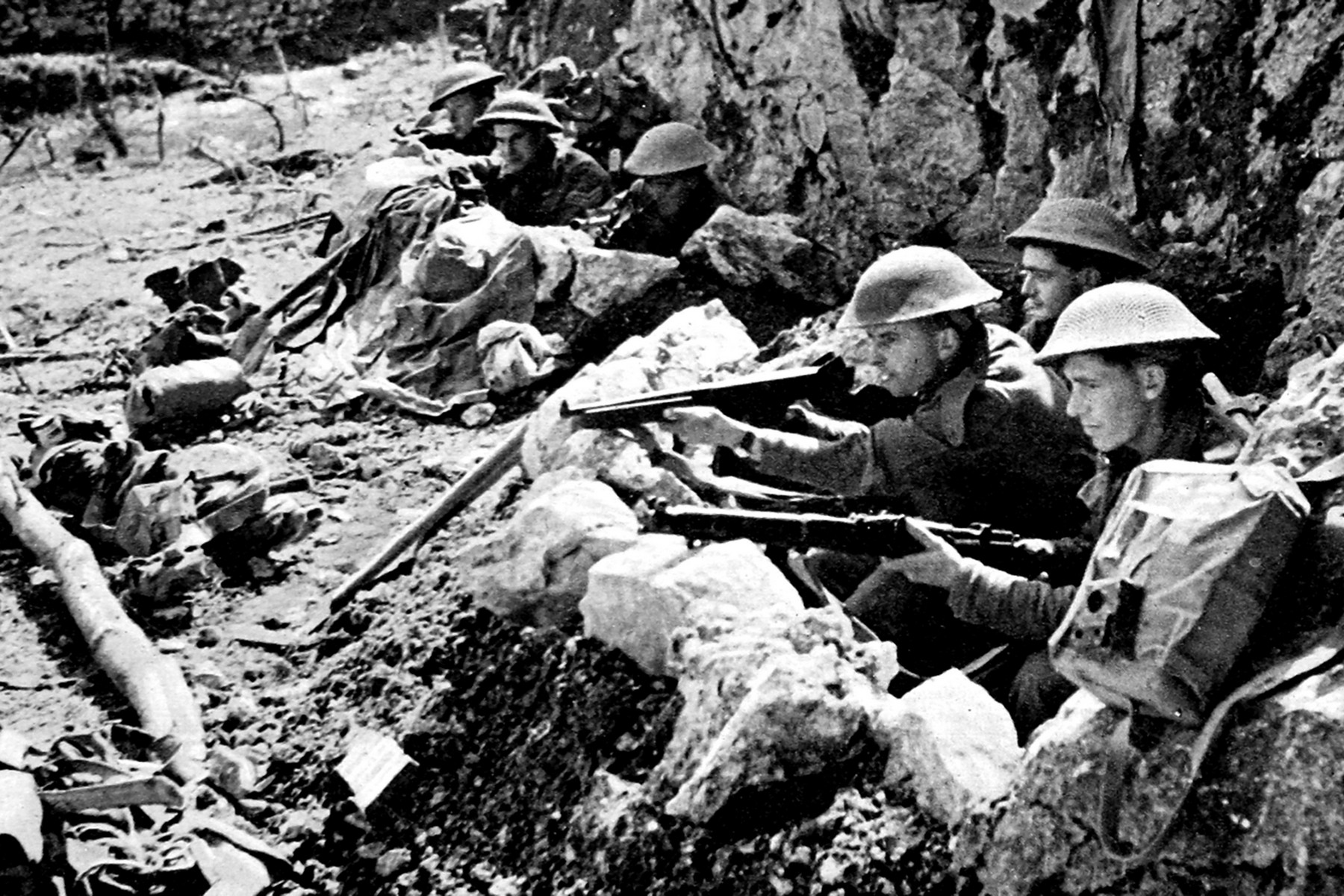 Britští vojáci v zákopech u Monte Cassina. Právě tažení Itálií se dočkalo kritiky kvůli vyčerpávajícím bitvám, až do konce války však vázalo početné německé jednotky.