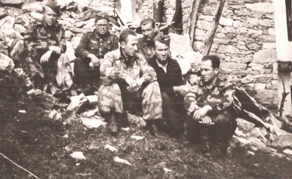 Skupina vládních vojáků partyzánského oddílu „Pudlo z Alp“ nad piemontským městečkem Coazze.