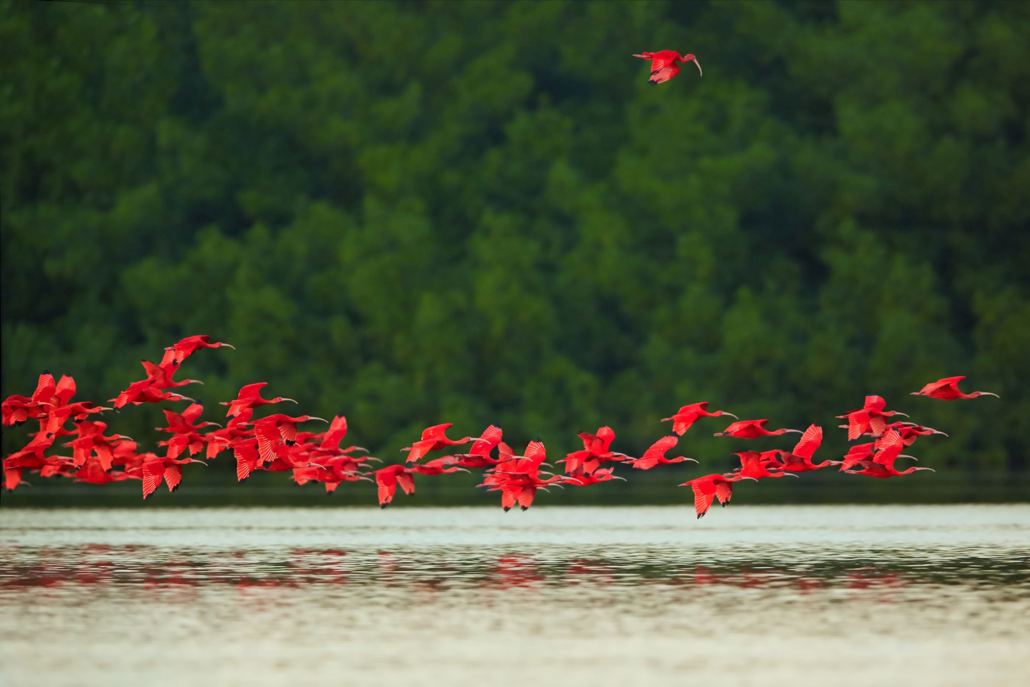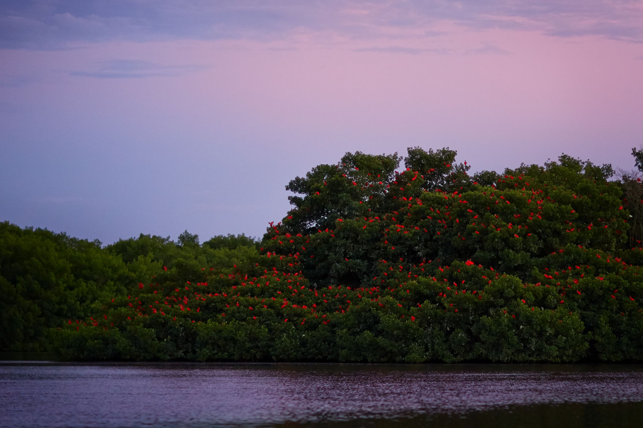 • Ibisové roztroušení po mangrovech mokřadu vypadají jako rudé kapky.