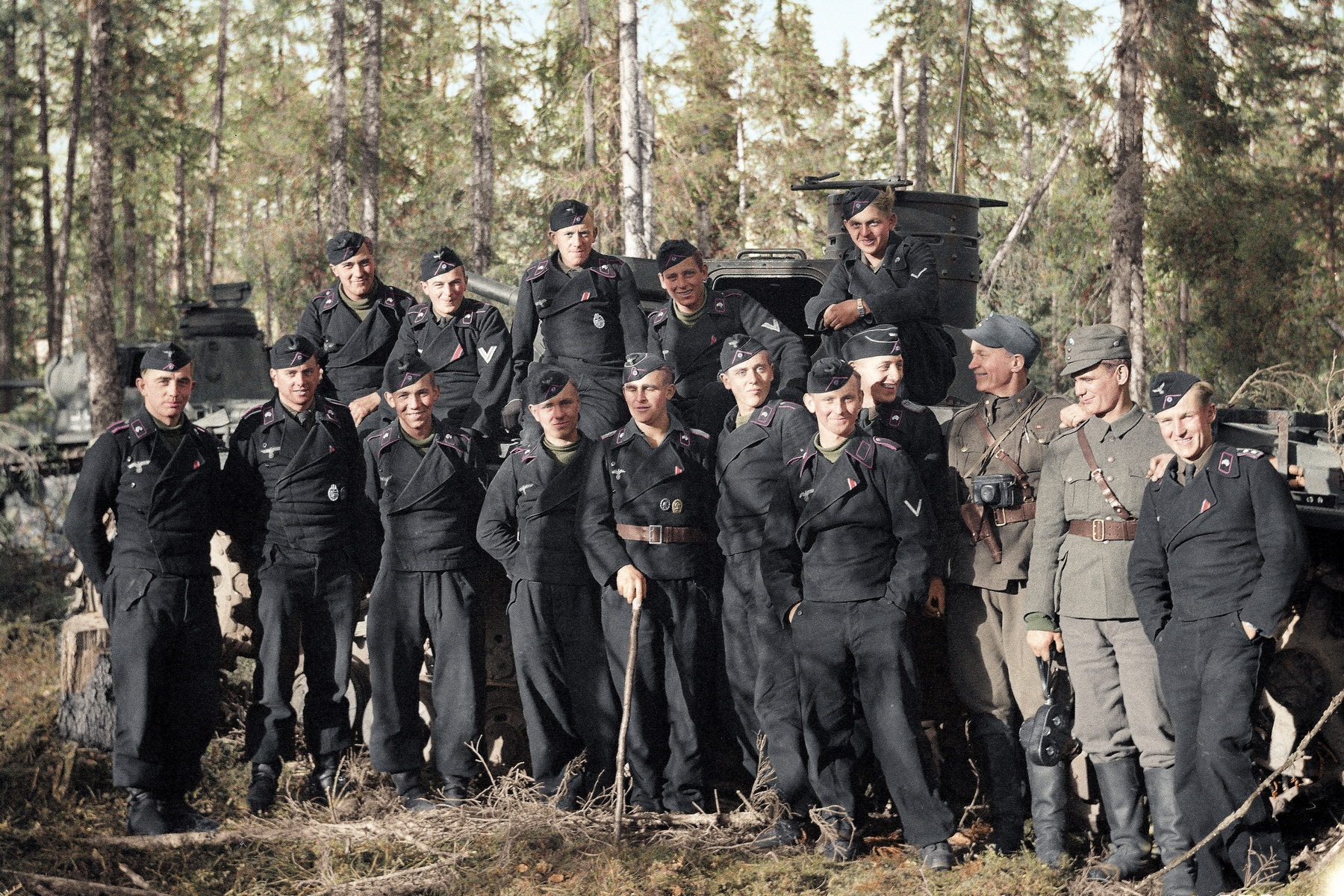 Ofenzivy se kromě dalších jednotek Wehrmachtu a Waffen-SS zúčastnily také německé tankové prapory 211 a 40. Na snímku příslušníci německého tankového praporu 40 se dvěma finskými důstojníky. (foto: SA Kuva, kolorováno (Julius Jääskeläinen), CC BY 4.0)