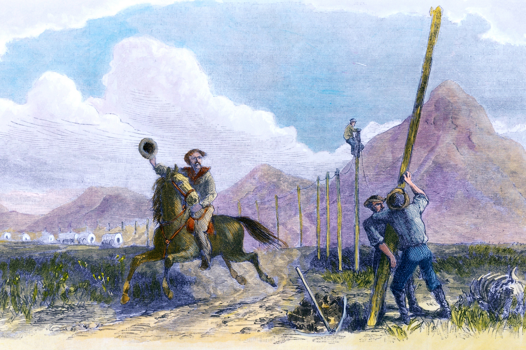 Setkání minulosti s budoucností – jezdec Pony Expressu míjí dělníky vztyčující telegrafní sloupy. (foto: Shutterstock)
