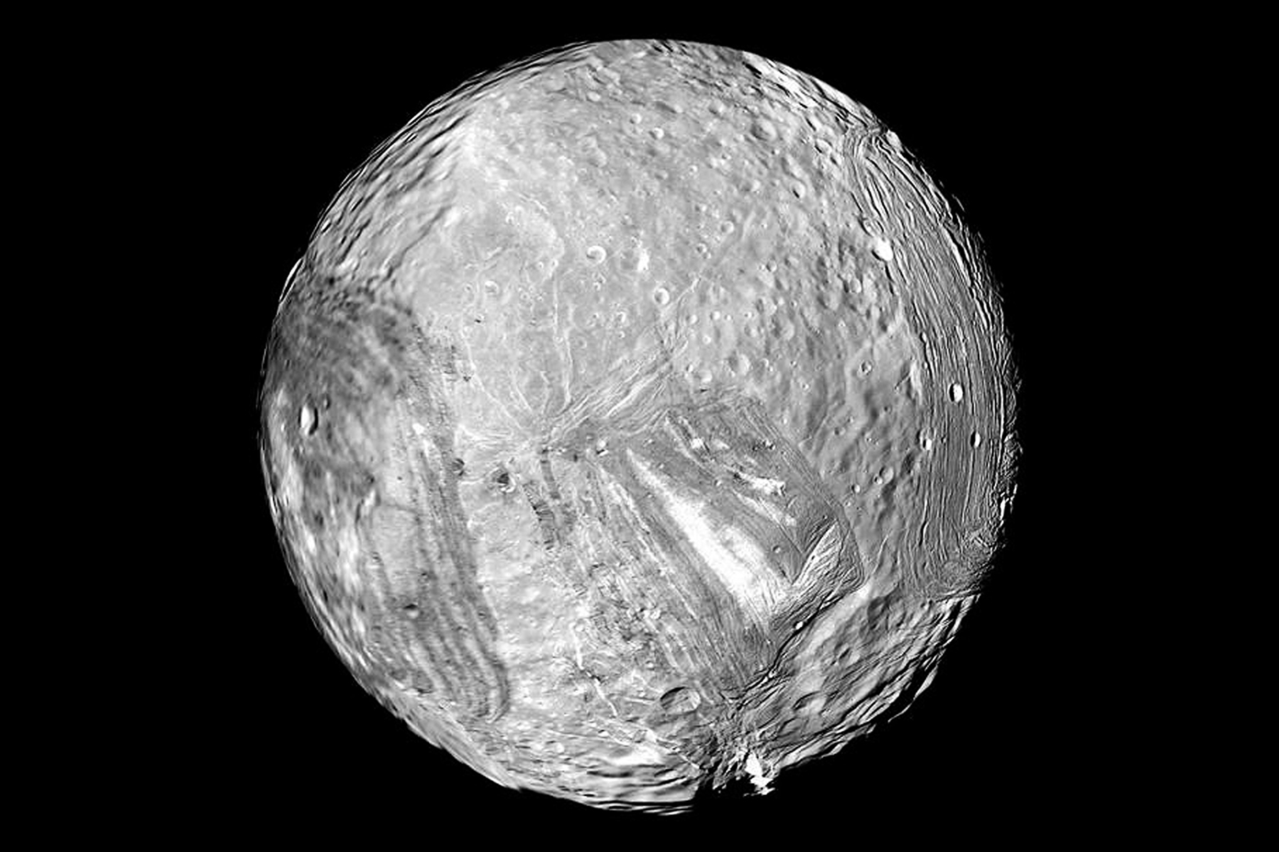 Měsíc Miranda, jak jej vyfotografovala sonda Voyager 2.