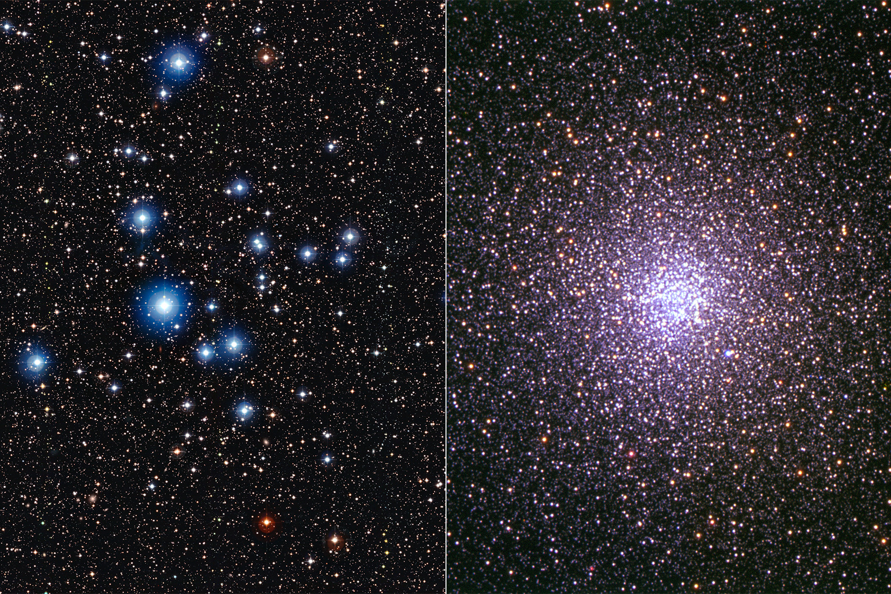 Otevřená hvězdokupa NGC 2547 (vlevo) obsahuje mladé, jasné hvězdy staré zhruba 30 milionů let. Kulová hvězdokupa 47 Tucanae (NGC 104) obsahuje miliony hvězd starých zhruba 13 miliard let. (foto: ESO + ESO, CC BY-SA 4.0)