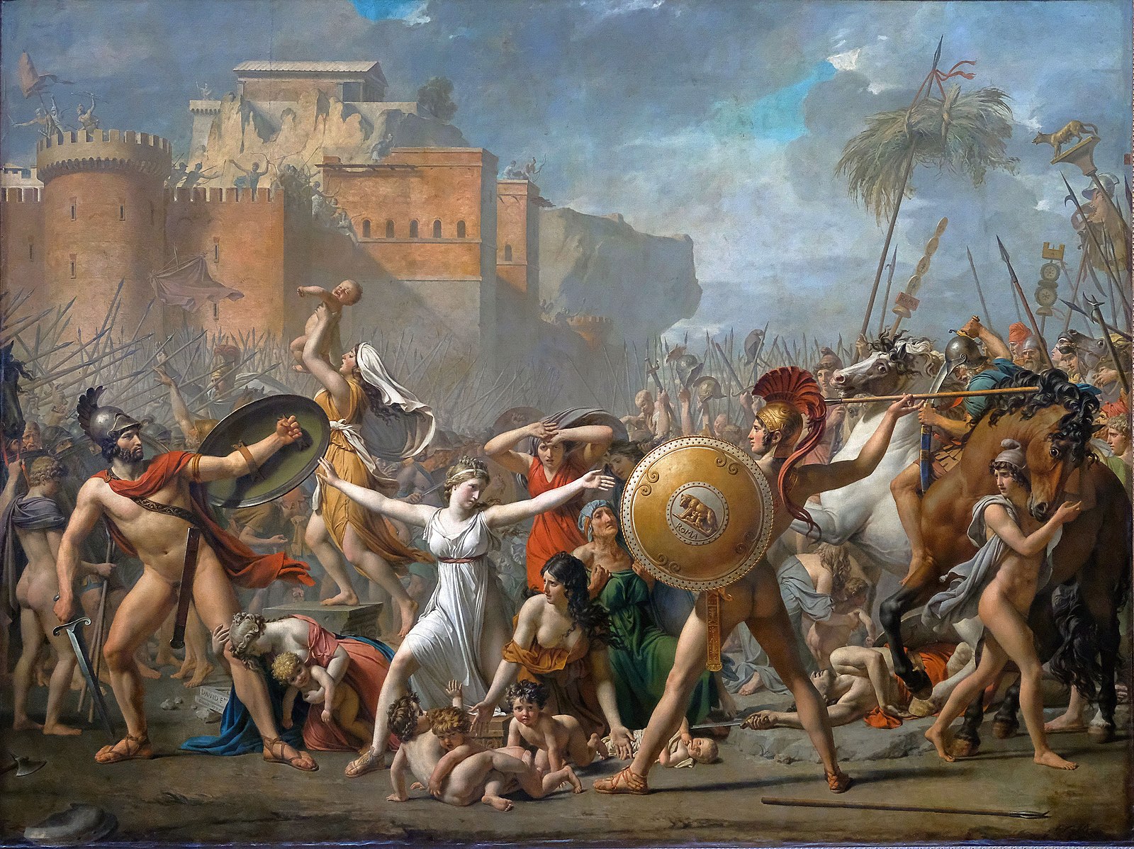 Zásah sabinských žen podle francouzského malíře Jacques-Louise Davida. S novorozeňaty v rukou ženy neohroženě rozdělily obě bojující strany – své sabinské otce i bratry a římské manžele. (foto: Wikimedia Commons, CC0)