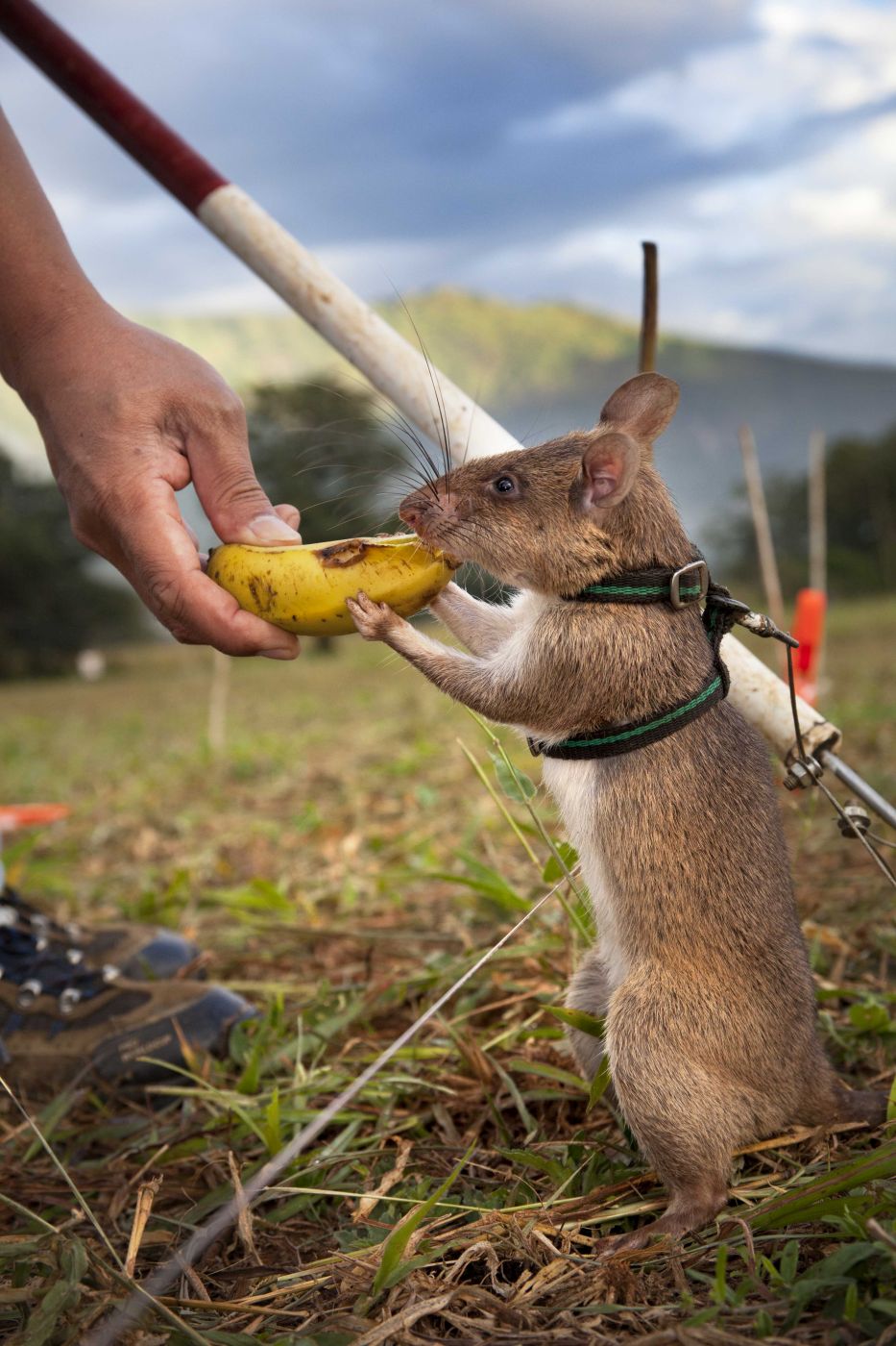 Za určení místa, kde se ukrývá výbušnina, si křečkomyši přicházejí pro zaslouženou odměnu. V laboratořích dostávají otvorem směs banánů a oříšků rozdrcených v injekční stříkačce. (foto: APOPO, CC0)