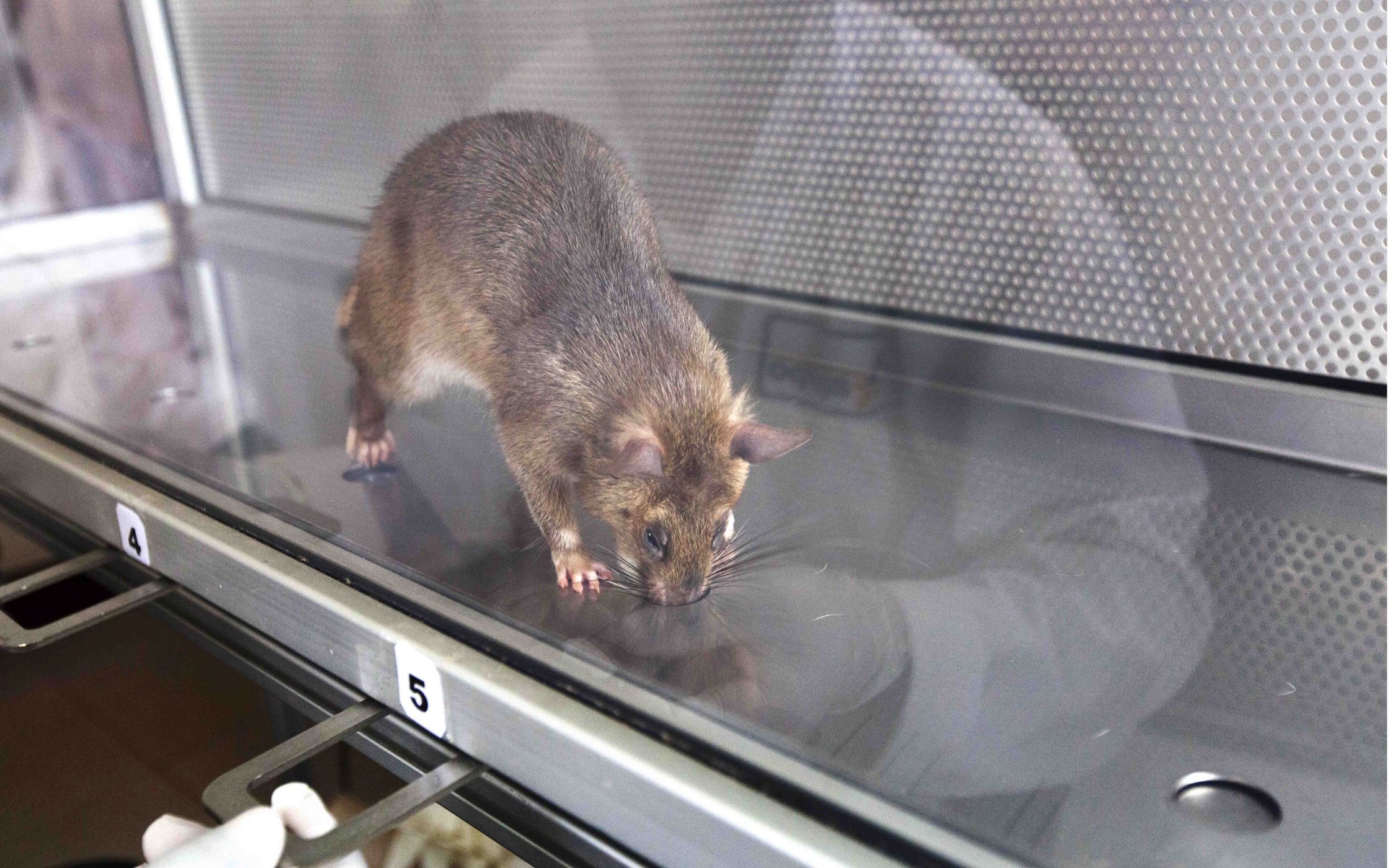 Krysí sameček pojmenovaný Julius hledá prochází vzorky z nemocnic a hrabáním označí takové, u nichž cítí přítomnost tuberkulózy. (foto: APOPO, CC0)