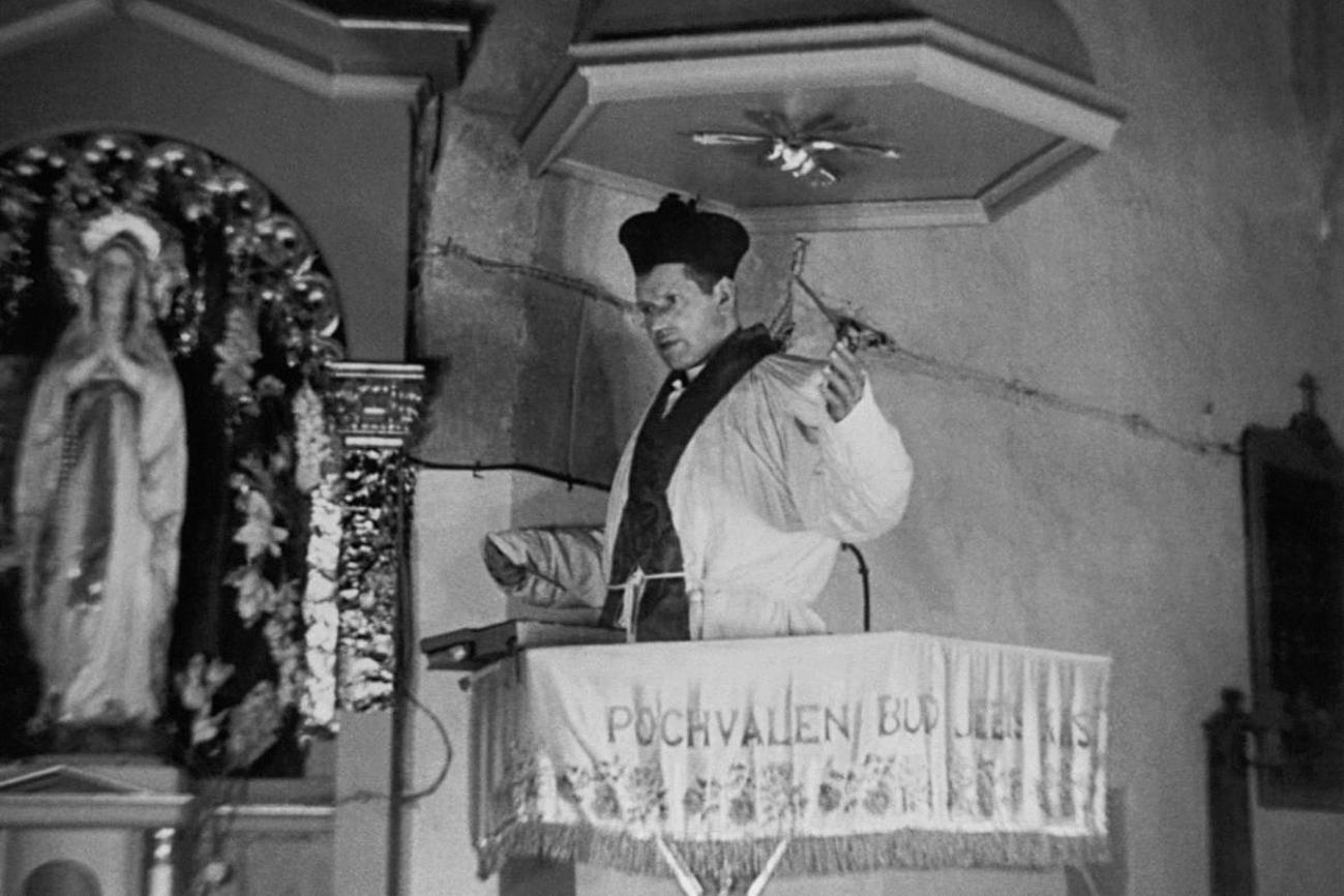 Falešný farář Toufar při filmové „rekonstrukci“ číhošťských událostí natočené StB.