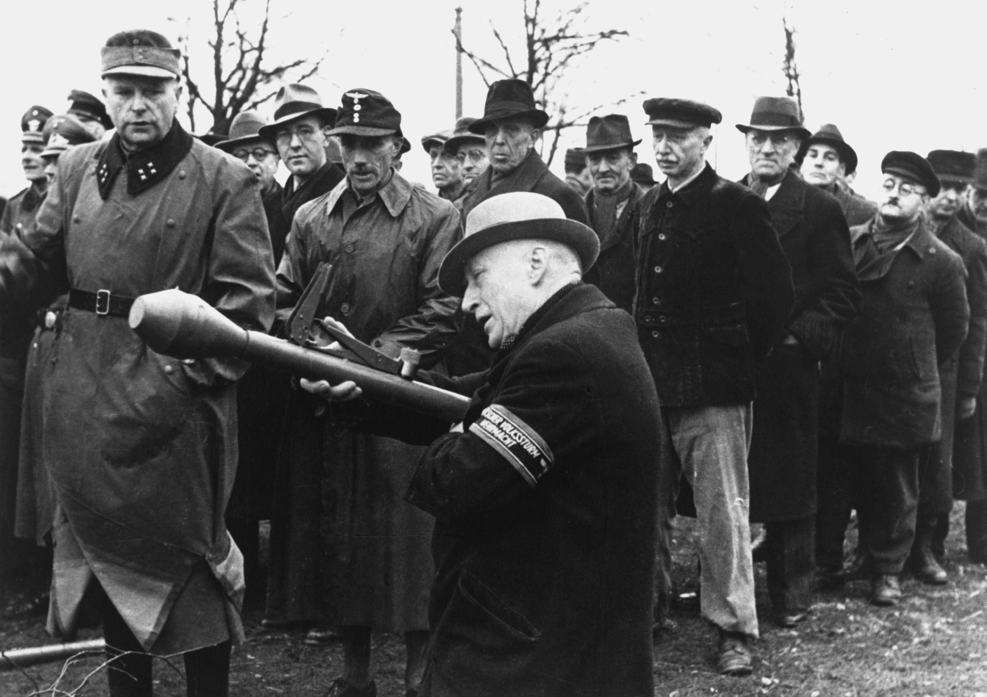 Poprvé se prapory domobrany objevily na frontě v říjnu 1944 ve Východním Prusku. Zde příslušník Volksturmu cvičí s pancéřovou pěstí pod dohledem esesáka.