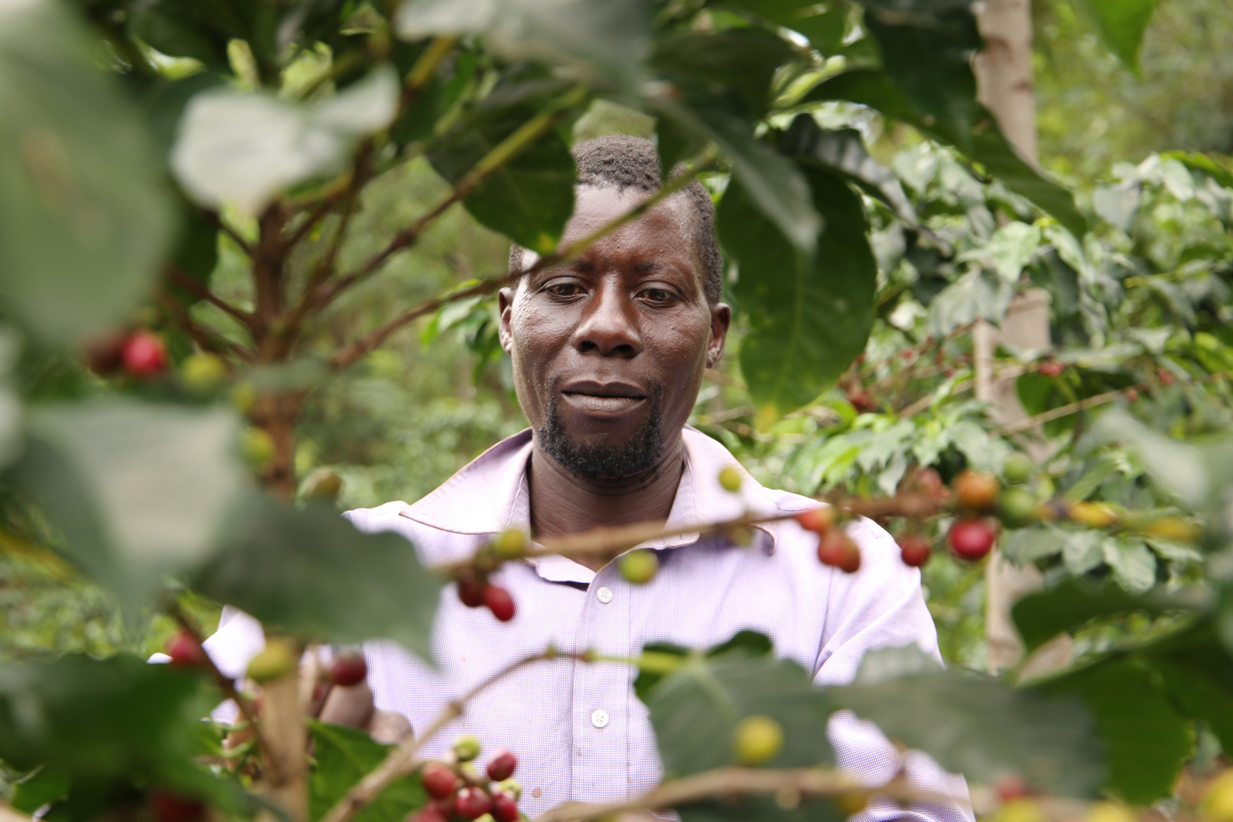 Keňský farmář v oblasti Kericho při sběru kávových zrn.