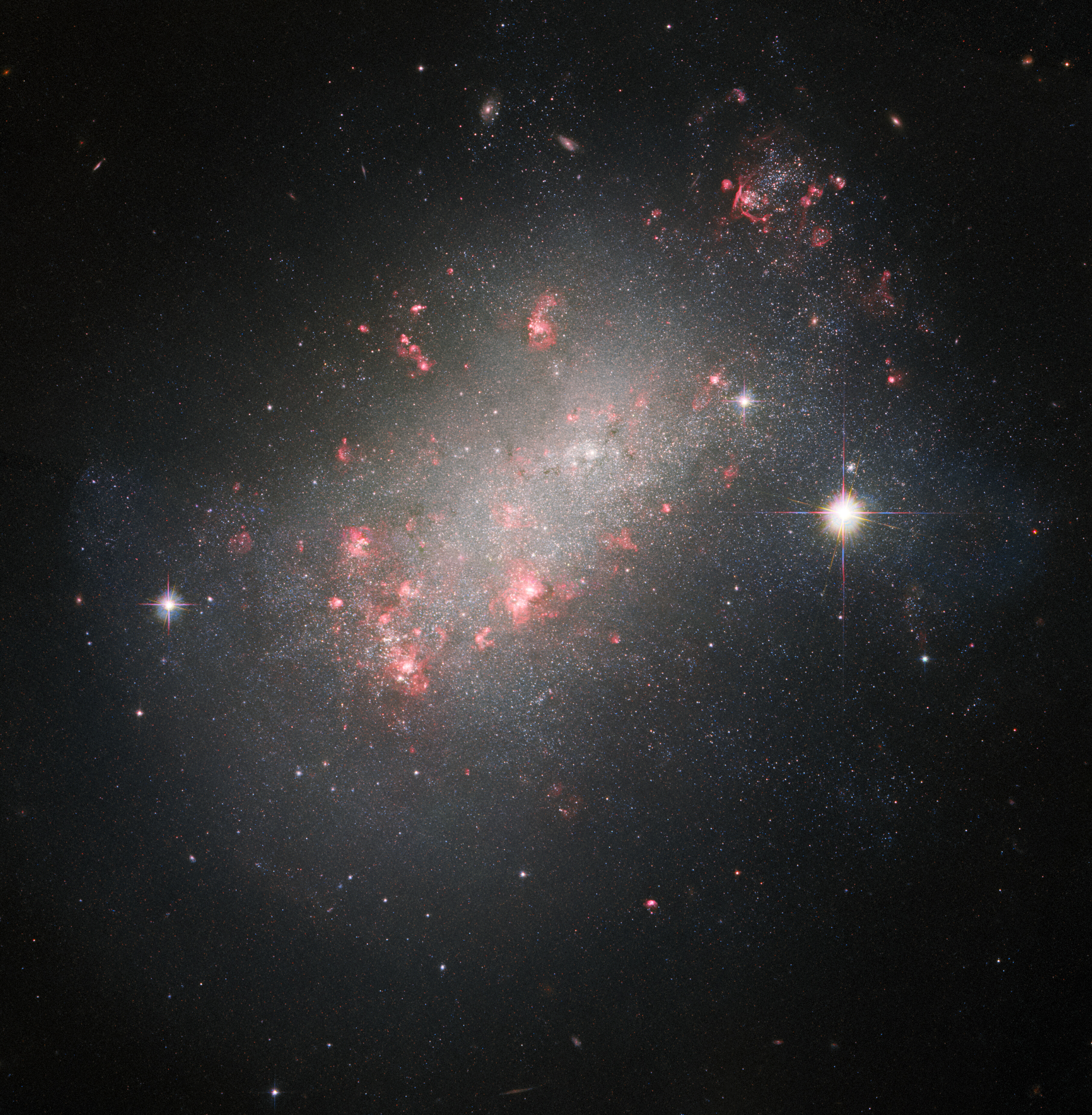 Nepravidelná a nápadně osiřelá trpasličí galaxie NGC 1156 se nachází asi 25 milionů světelných let daleko. (foto: ESA/Hubble & NASA, R. B. Tully, R. Jansen, R. Windhorst, CC BY-SA 4.0)