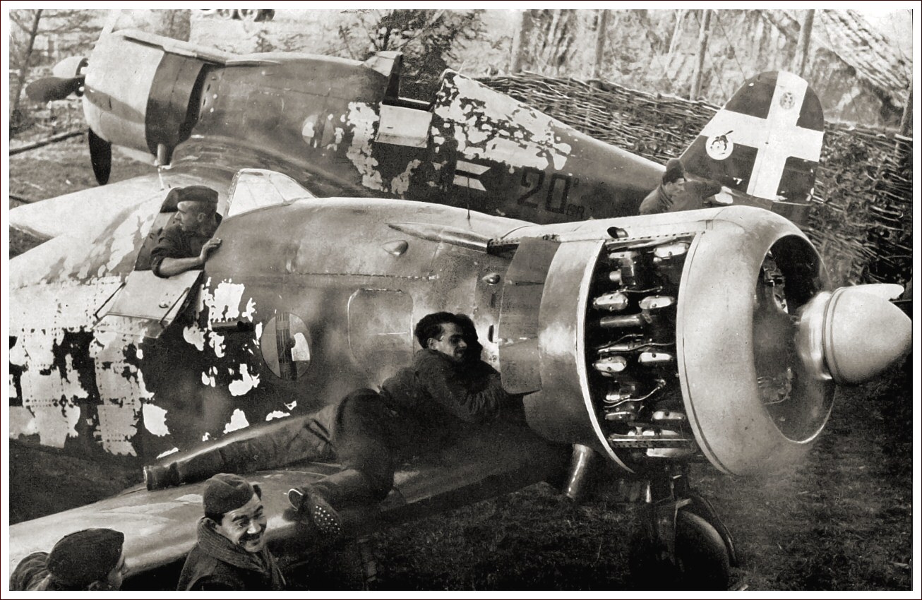 Skupina mechaniků pracuje na italských stíhačkách Fiat G.50.