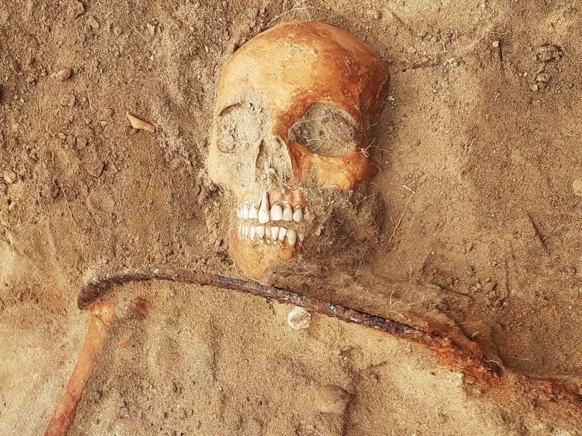 Žena „upírka“ s vyčnívajícím zubem a srpem přes krk. (foto: Nicolaus Copernicus University, Mirosław Blicharski, CC BY 4.0)