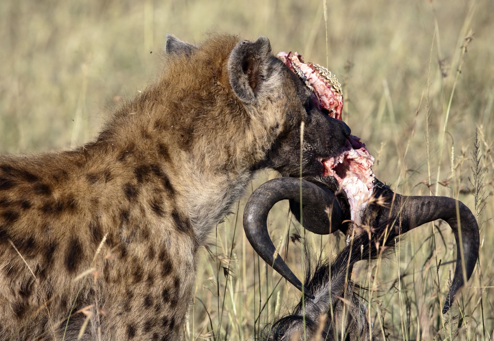 Navzdory stále rozšířené představě si hyeny drtivou většinu potravy uloví. Naproti tomu lev hyenám jejich kořist často krade. Lev na této fotografii s velkou pravděpodobností zvažuje, zda mu zbytky hyeního úlovku stojí za riskantní krádež. (foto: Shutterstock)